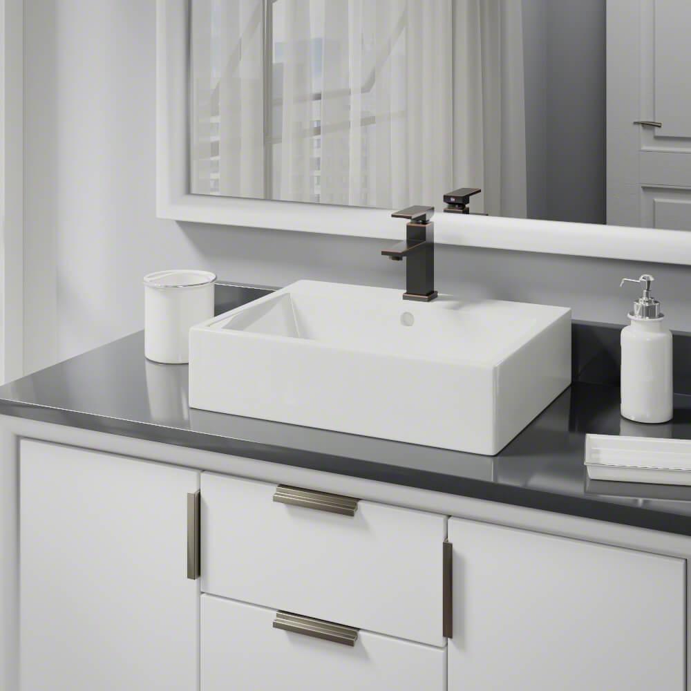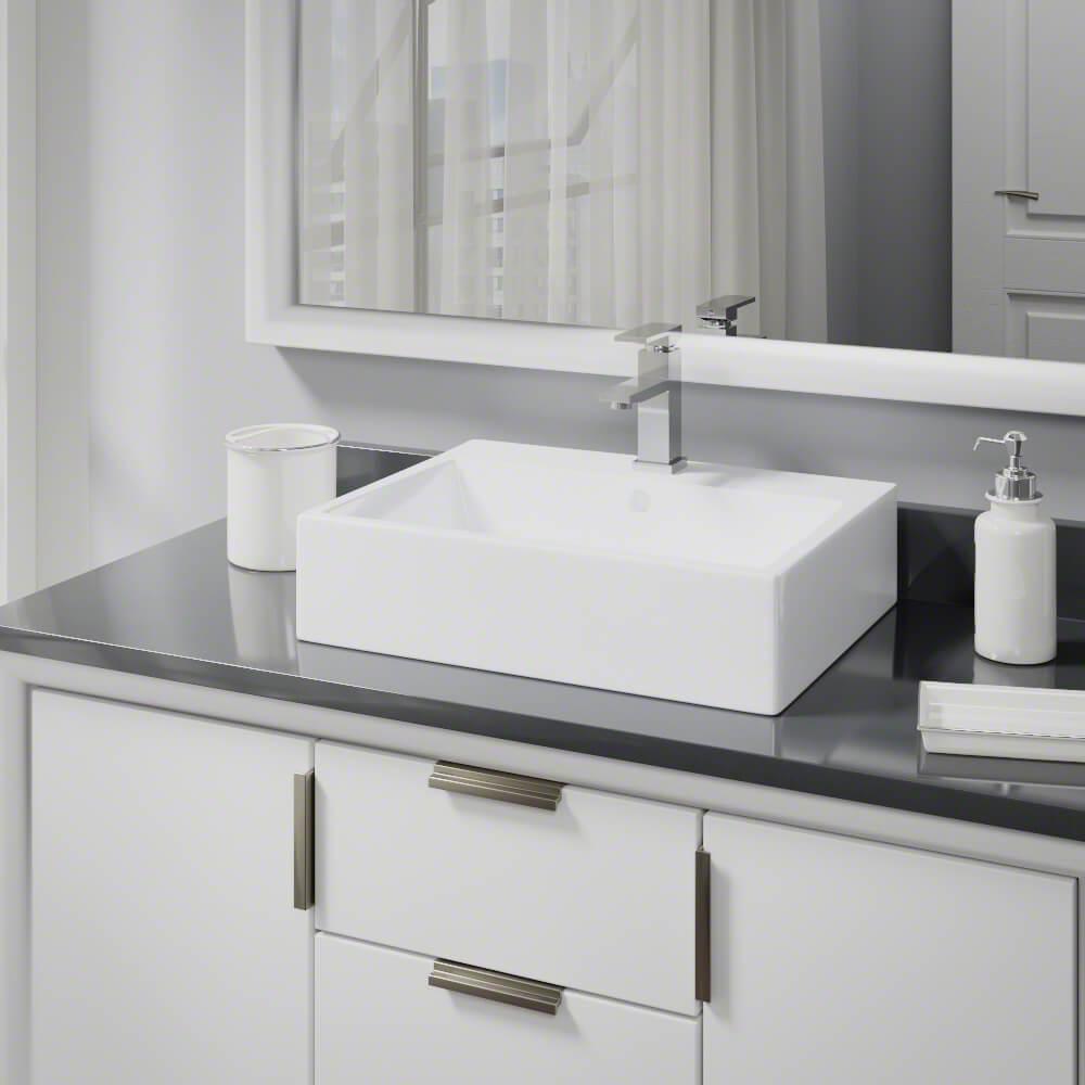 - Captivating form - a glistening, rectangular vessel with pre-drilled faucet hole and overflow