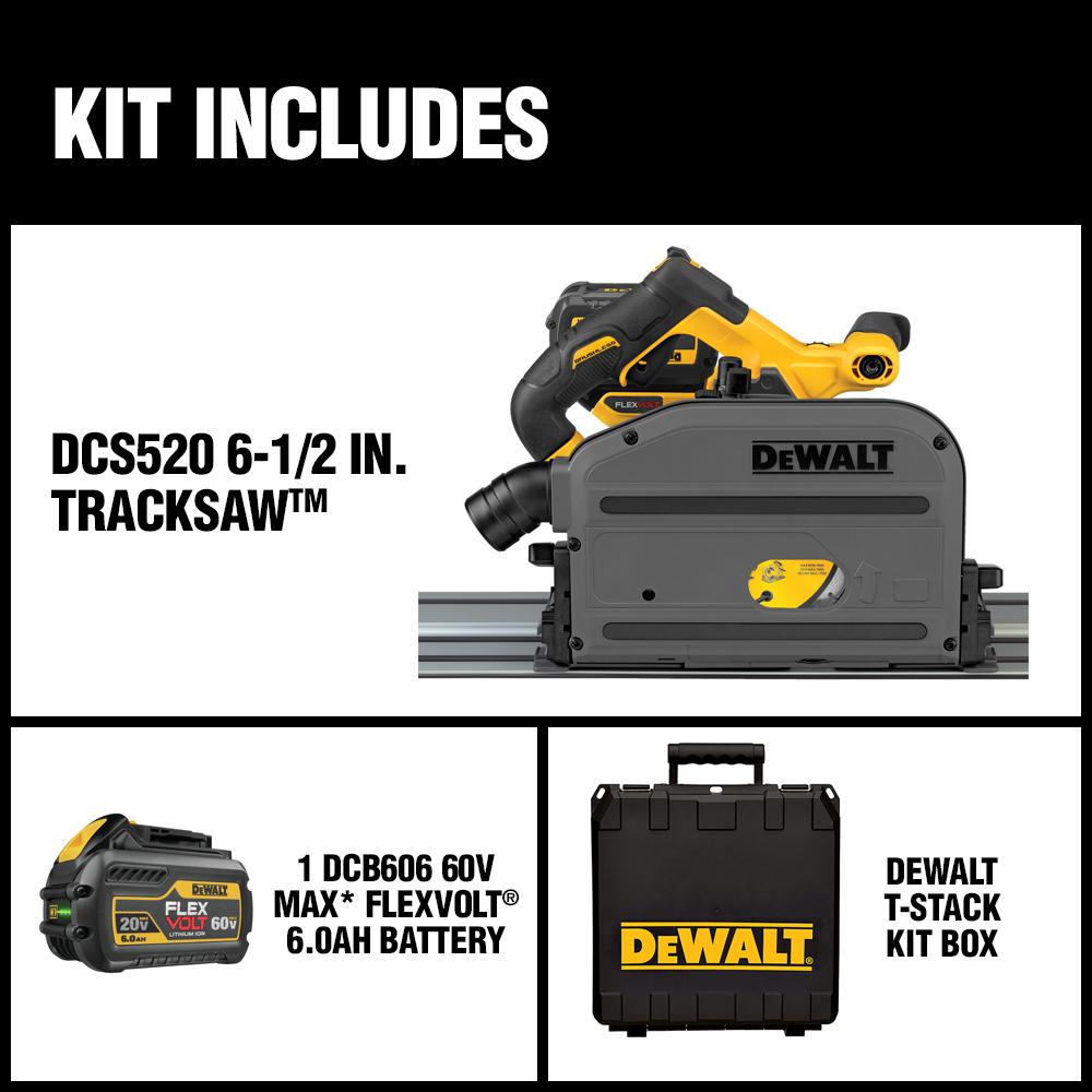 The DCS520T1 60-Volt MAX 6-1/2 in. TrackSaw Kit has a brushless motor to easily power through hardwoods up to 2-1/8 in. thick. Features straight plunge mechanism for optimal ergonomics. For use with TrackSaw cutting system to deliver precise, straight, splinter-free cuts.