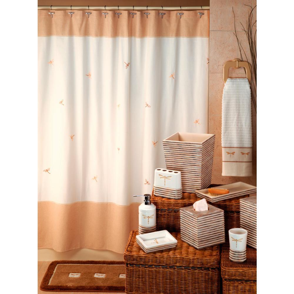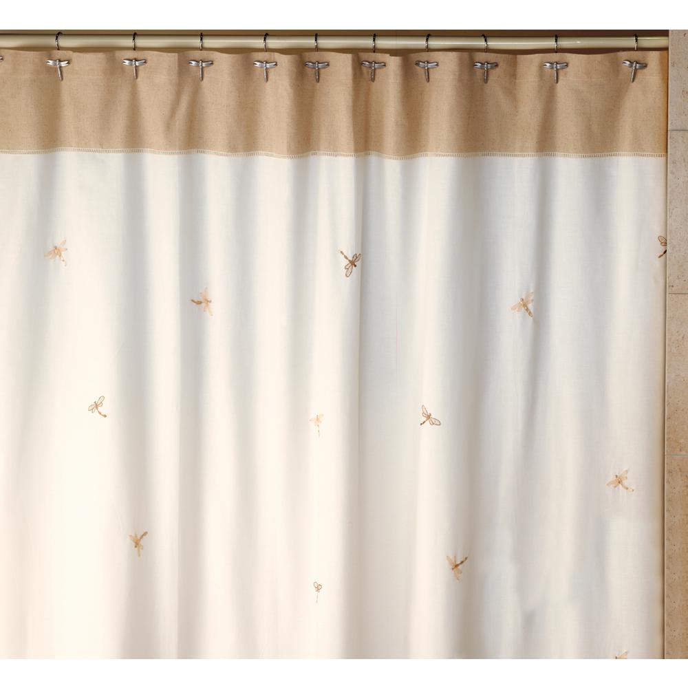 Bring an 'Old World' romantic elegance to your bathroom with this beautiful 3-piece. 'Dragonfly' Shower Curtain/Curtain Hooks/Bath Rug set. This collection's attractive nature motif in earth tones is pleasing to the eye. Manufactured from 100% cotton, the shower curtain features unique, embroidered dragonflies. Shower curtain hooks contain 12 hooks.