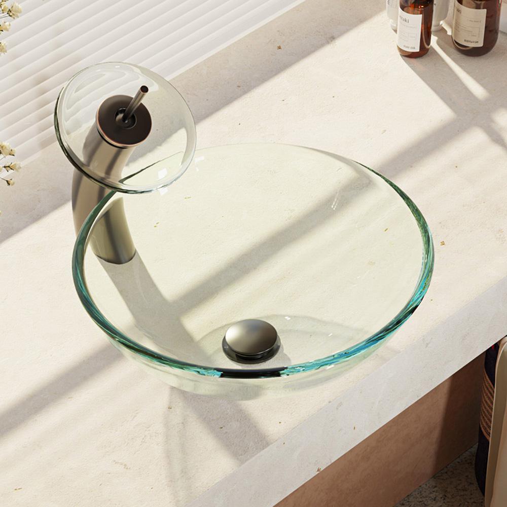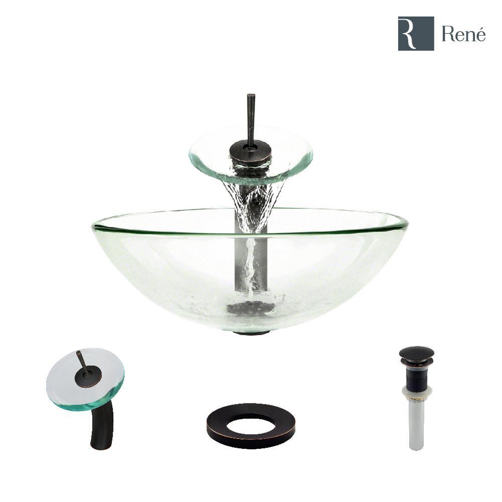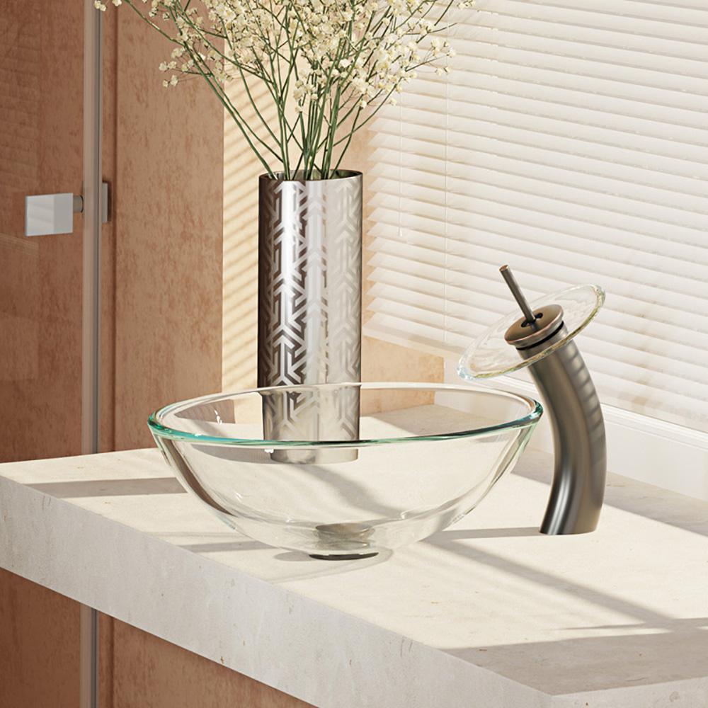 The shimmering elegance of glass is something to behold as this crystal-clear vessel rests upon the vanity for all to admire. As with all our glass vessels, the R5-5001-Crystal is constructed to be bold and beautiful. Only extra-thick, tempered glass is used in its manufacture. High temperatures will not mar it in any way. Good hygiene comes naturally, as glass is non-porous. Staining or retention of odors is unheard of. Clean up is simple. It measures 16-1/2 in. x 16-1/2 in. x 5-3/4 in. and is guaranteed to remain functional and engaging for life. The WF-R5-5001-CRY-ABR is an intriguing, waterfall-style faucet soundly constructed of premium-quality, solid brass components. The disc encircling the spout is formed from the same material as the basin below. Gracefully bending over the basin is a curved shaft topped with a toggle control handle, all in an attractive antique bronze finish. To stabilize this curved basin above the vanity, this antique bronze sink ring is included. With a simple press to its handsome, antique bronze dome; the included, spring-loaded, vessel pop-up drain can be opened or closed.
