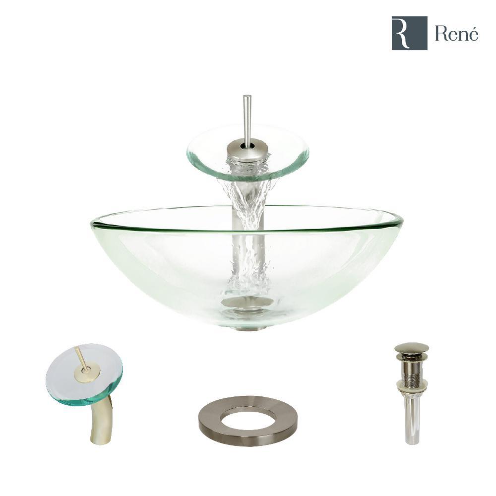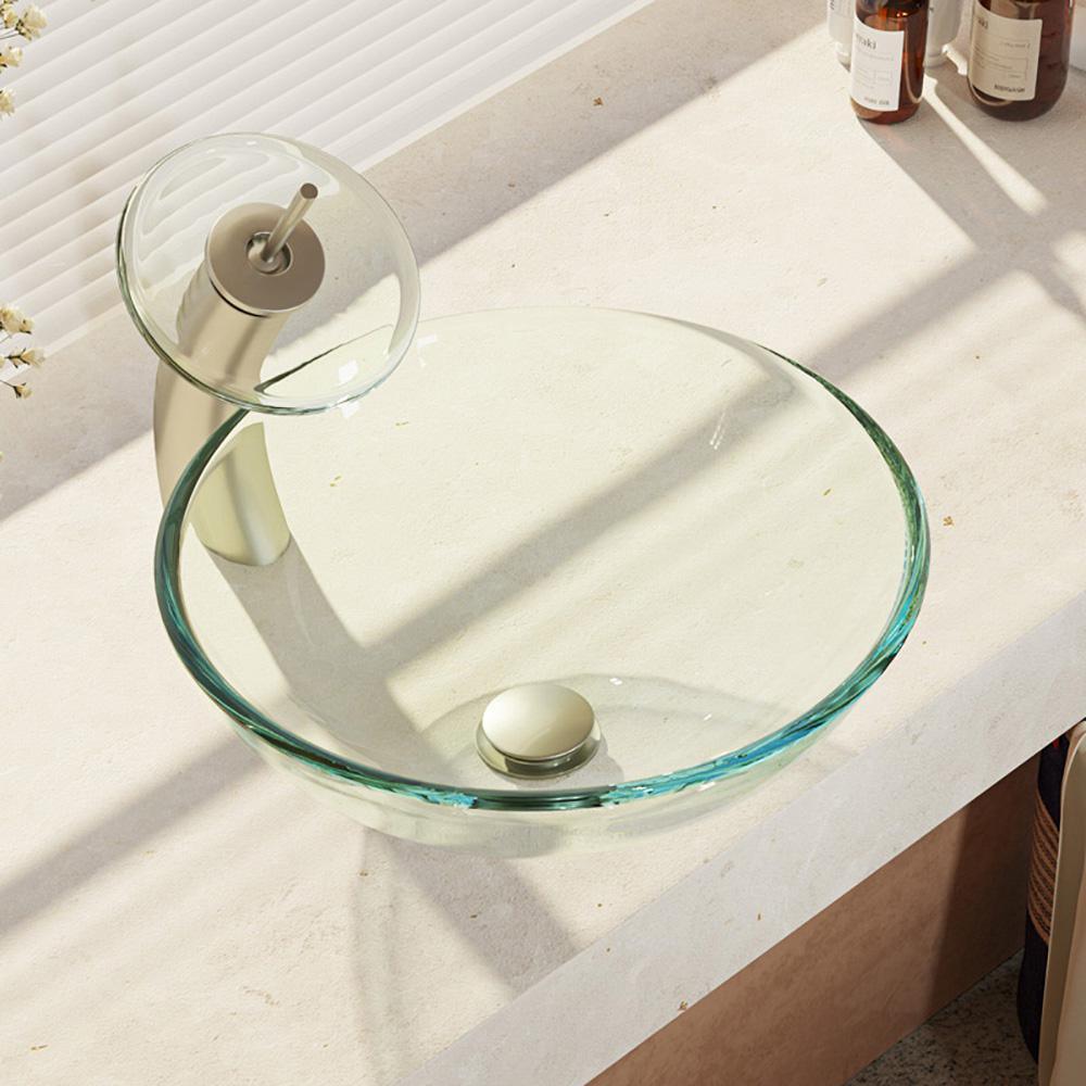 The shimmering elegance of glass is something to behold as this crystal-clear vessel rests upon the vanity for all to admire. As with all our glass vessels, the R5-5001-Crystal is constructed to be bold and beautiful. Only extra-thick, tempered glass is used in its manufacture. High temperatures will not mar it in any way. Good hygiene comes naturally, as glass is non-porous. Staining or retention of odors is unheard of. Clean up is simple. It measures 16-1/2 in. x 16-1/2 in. x 5-3/4 in. and is guaranteed to remain functional and engaging for life. The WF-R5-5001-CRY-BN is an intriguing, waterfall-style faucet soundly constructed of premium-quality, solid brass components. The disc encircling the spout is formed from the same material as the basin below. Gracefully bending over the basin is a curved shaft topped with a toggle control handle, all in an attractive brushed nickel finish. To stabilize this curved basin above the vanity, this brushed nickel sink ring is included. With a simple press to its handsome, brushed nickel dome; the included, spring-loaded, vessel pop-up drain can be opened or closed.