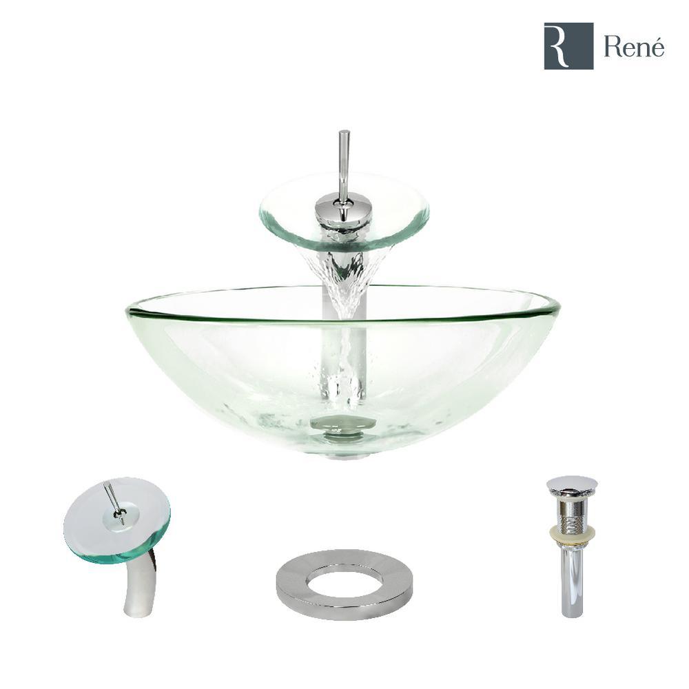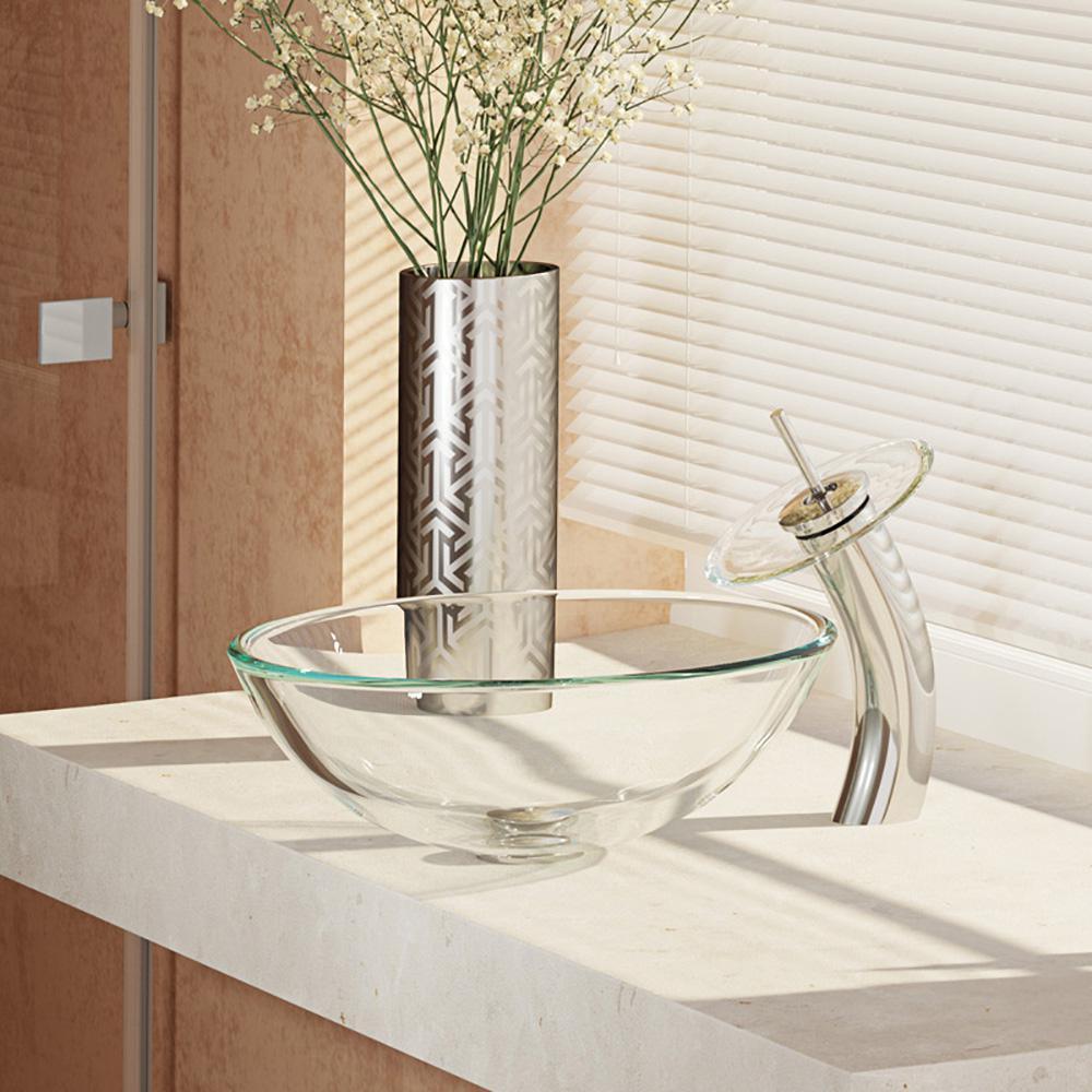 The shimmering elegance of glass is something to behold as this crystal-clear vessel rests upon the vanity for all to admire. As with all our glass vessels, the R5-5001-Crystal is constructed to be bold and beautiful. Only extra-thick, tempered glass is used in its manufacture. High temperatures will not mar it in any way. Good hygiene comes naturally, as glass is non-porous. Staining or retention of odors is unheard of. Clean up is simple. It measures 16-1/2 in. x 16-1/2 in. x 5-3/4 in. and is guaranteed to remain functional and engaging for life. The WF-R5-5001-CRY-C is an intriguing, waterfall-style faucet soundly constructed of premium-quality, solid brass components. The disc encircling the spout is formed from the same material as the basin below. Gracefully bending over the basin is a curved shaft topped with a toggle control handle, all in an attractive chrome finish. To stabilize this curved basin above the vanity, this chrome sink ring is included. With a simple press to its handsome, chrome dome; the included, spring-loaded, vessel pop-up drain can be opened or closed.