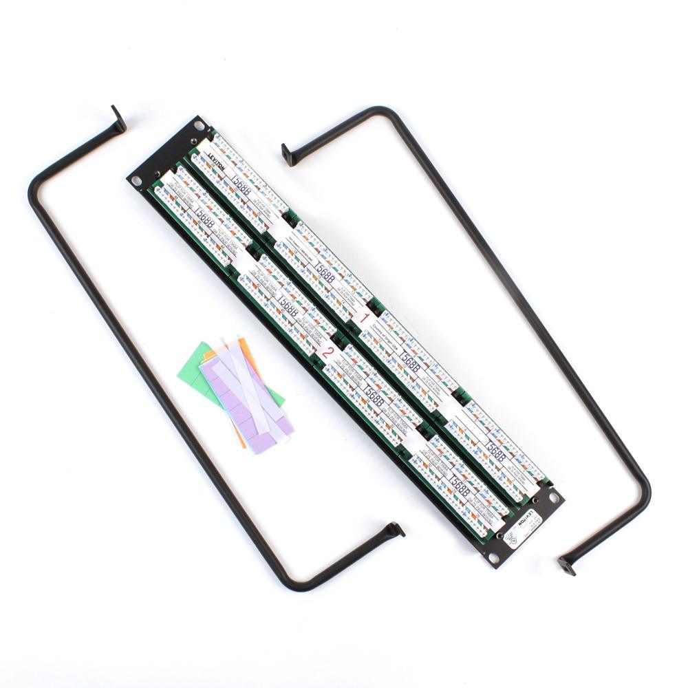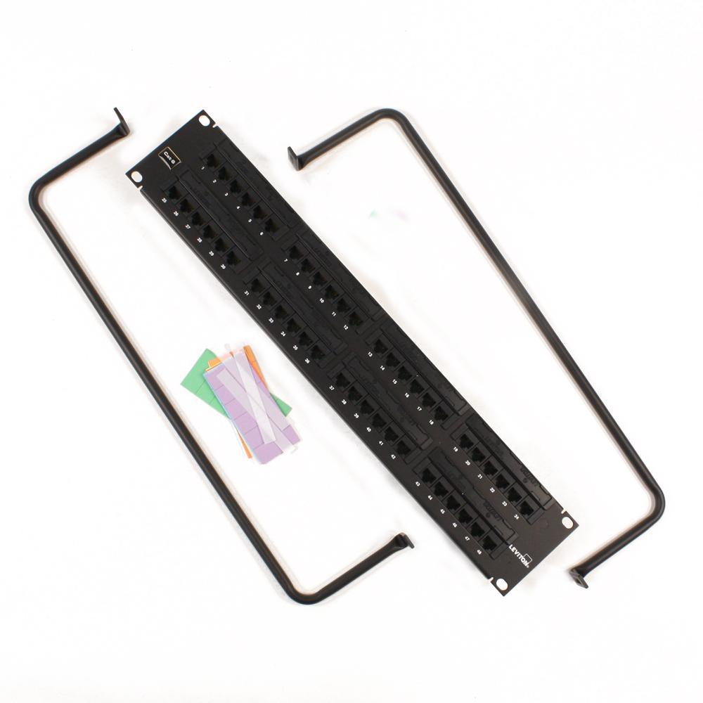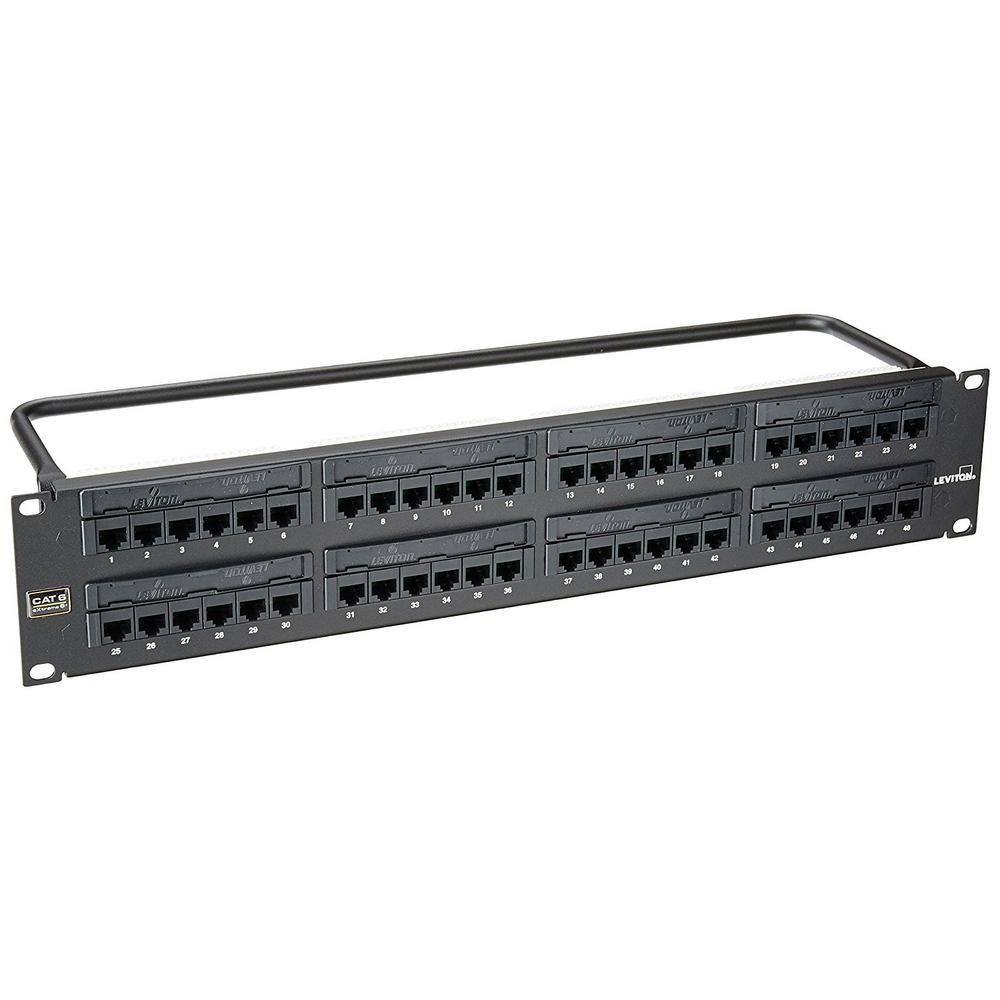 eXtreme 6+ Universal Patch Panel, 48-Port, 2RU, CAT 6. Cable management bar included. Leviton eXtreme 6+ CAT 6 Flat 110-Style patch panels are designed for use on 19 in. standard racks and cabinets. The patch panels include Leviton’s patented Retention Force Technology, which promotes consistent performance over the life of the system. Installer-friendly design allows for quick installation due to standard 110 terminations on the rear of the panel, which follow the normal installation color sequence (blue orange, green, brown) from left to right. The eXtreme 6+ CAT 6 system is designed for use in high megabit applications such as Gigabit Ethernet. Patented retention force technology protectstines from damage from 4- or 6-pin plugs Craft-friendly installation T568A and T568B wiring cards for 110-style IDC terminations Color-coded front labeling for easy port identification (TIA-606-A compliant) Grounding standoff for optional earthling/grounding Terminates 26-22 AWG solid conductors Capable of multiple determinations.