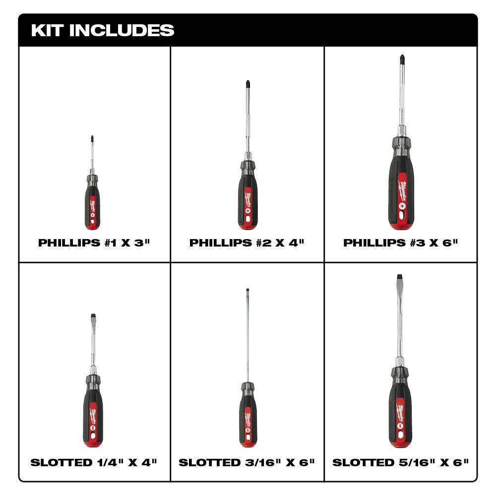 • Includes: (1) Phillips #1 x 3 in., (1) Phillips #2 x 4 in., (1) Phillips #3x6 in., (1) slotted 1/4 in. x 4 in., (1) slotted 3/16 in. x 6 in., (1) slotted 5/16 in. x 6 in.
