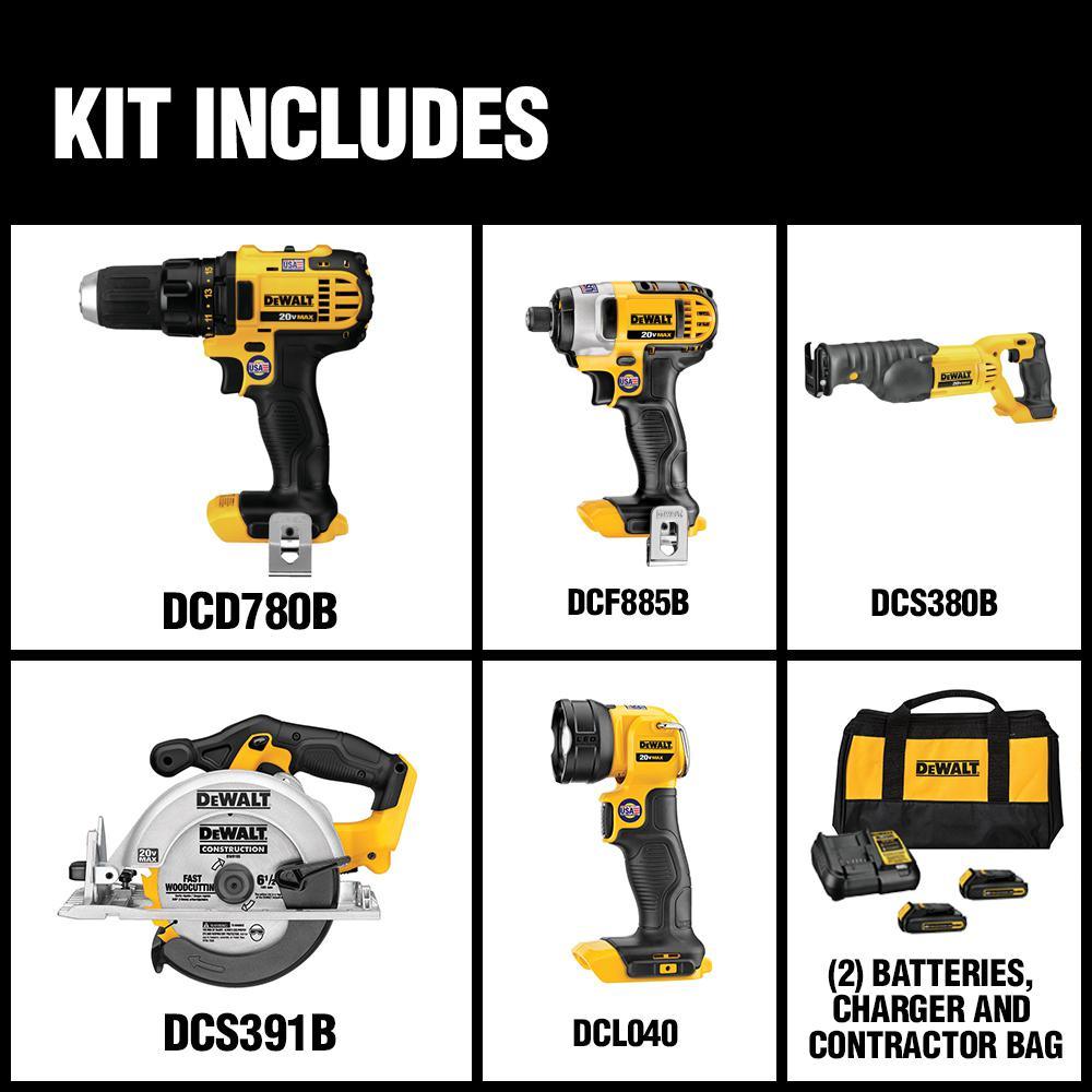 The DEWALT 5-Tool Combo Kit (DCK520D2) is ideal for most cutting and fastening applications on the job site or at home. This combo kit features a drill driver, impact driver, reciprocating saw, circular saw, two batteries, a charger, carrying bag and work light. The DCK520D2 is backed by a DEWALT 3-year limited warranty for added peace of mind, so you can count on tools that are built to last.