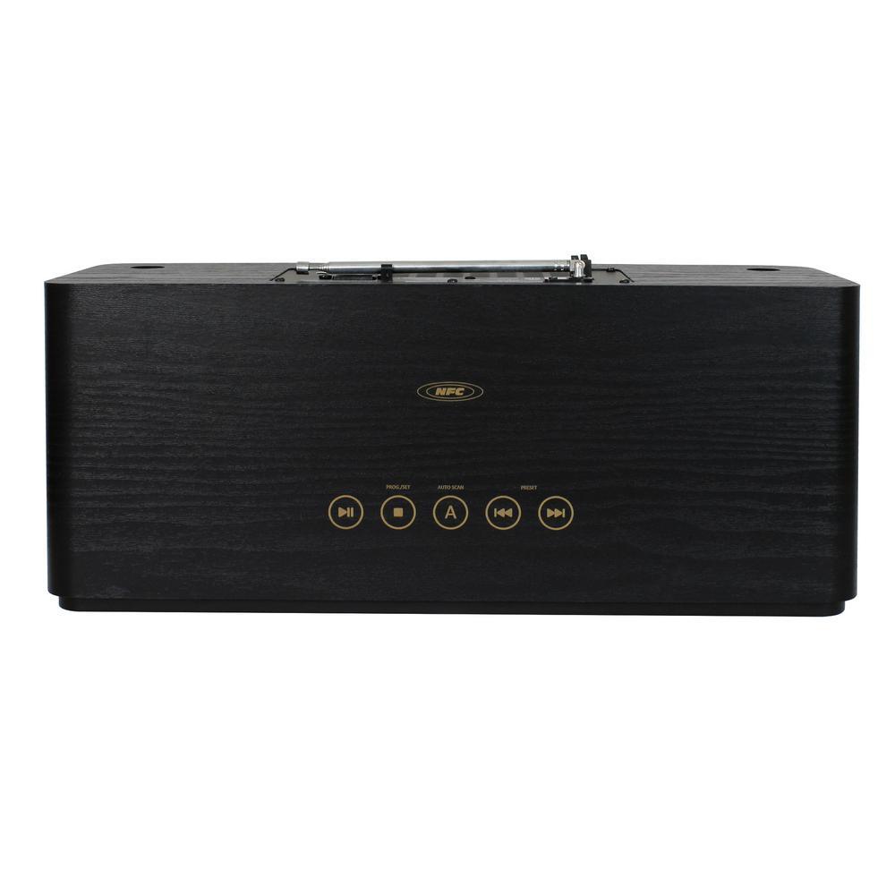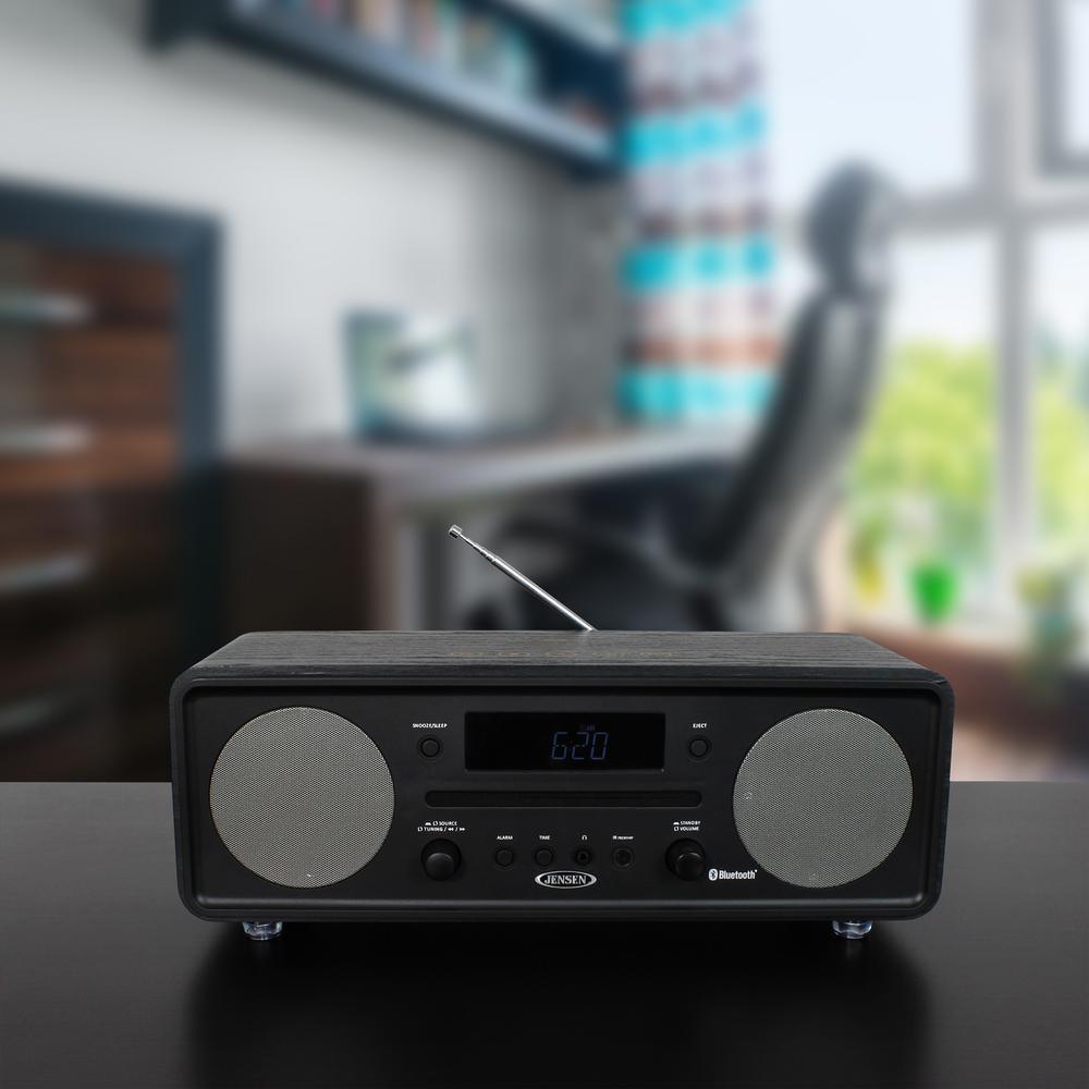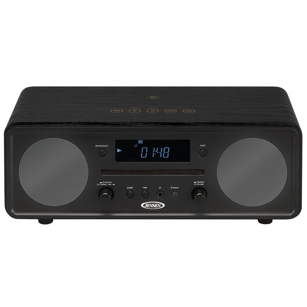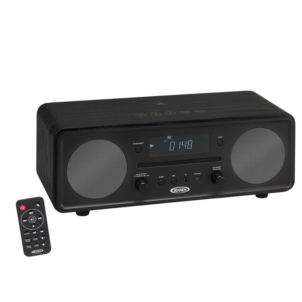 The JENSEN JBS-600 is a stylish desktop audio system with amazing sound and convenient built-in features. The JBS-600 features Bluetooth wireless connectivity with NFC (Near Field Communication) for easy pairing. The front slot loading CD player plays standard store bought CDs as well as CDs made on your personal computer. The JBS-600 offers a sleek, traditional design allowing it to seamlessly integrate with many different styles in the home or office. Along with the CD function is an AM/FM digital tuner with multi-function backlit LCD display. The unit also features an aux-in jack, headphone jack, remote control, 2-Watt x 10-Watt (RMS) output power, and operates using the included 120-Volt AC adaptor.