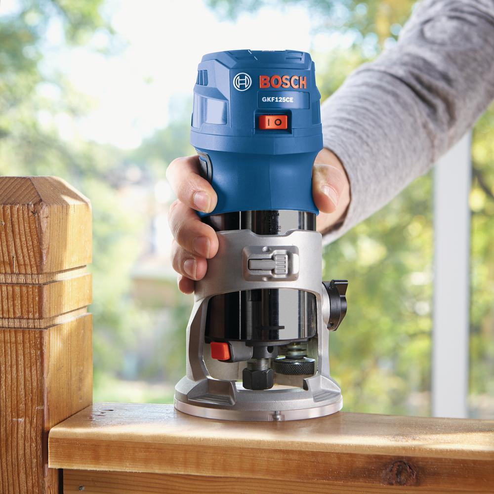 The Bosch GKF125CEPK Colt 1.25 HP (Max) Variable-Speed Palm Router Combination Kit pairs a tool that lets you feel the power in your hand with a fixed base and a plunge base. The GKF125CEPK has an ergonomic palm-grip design with soft-grip. It has ample power, with a 1.25 HP (max) rating. Far more than a laminate trimmer, it is the ideal tool for rounding-over railings, hinge mortising, decorative edge forming and more, as well as laminate trimming. The motor features soft-start circuitry, a variable-speed dial and Constant Response circuitry. Its fixed base features macro- and micro-fine depth adjustment and a centerable round subbase. The plunge base features a Precision Centering Design to keep the bit on the cut line, as well as a spring-lock plunge lever depth rod with fine adjustment. The quick-clamp system allow user to move the motor to move from base to base. The kit includes straight-edge guide and a carrying case.