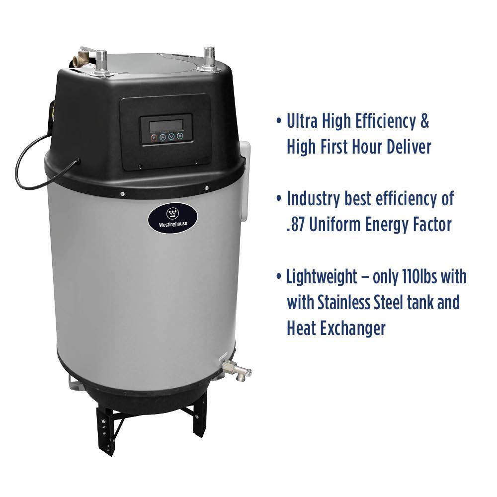 • Produces more hot water than a traditional 50-gallon (40K BTU) water heater