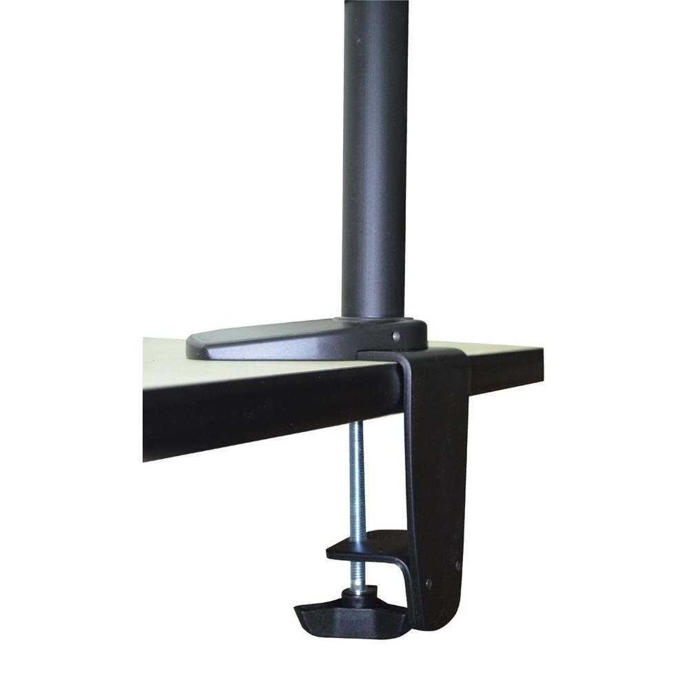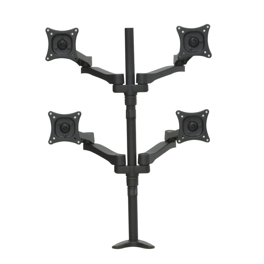 Regency's Quad Articulating Monitor Mount provides a customized display option for four screens. Tilt, pan, height and swivel adjustments ease stress from straining to see monitors that are too high, too low or at the wrong angle. Its sturdy metal base and articulating arm are finished in a matte black to compliment any decor and desk finish. Wire management clips around the base keep cords neat and tidy and work surfaces clear. The Mount attaches to virtually any desktop with either a clamp or grommet and accommodates most 12 in. to 24 in. screens. Regency Monitor Mounts are backed by a five-year limited manufacturers warranty.