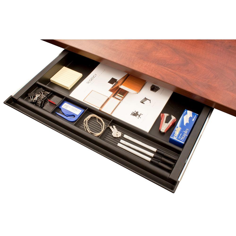 Add a little extra organization with Regency's Center Drawer. Its five various-sized compartments help keep commonly used supplies out of sight but still within reach. It mounts to the underside of any wood surface with included hardware. The tray is constructed of a black blow mold plastic that is durable and can withstand every day use. At only 2.5 in. thick, the Center Drawer slides in and out with great ease without compromising knee space under the desk. The Center Drawer is backed by a five-year limited manufacturer's warranty.