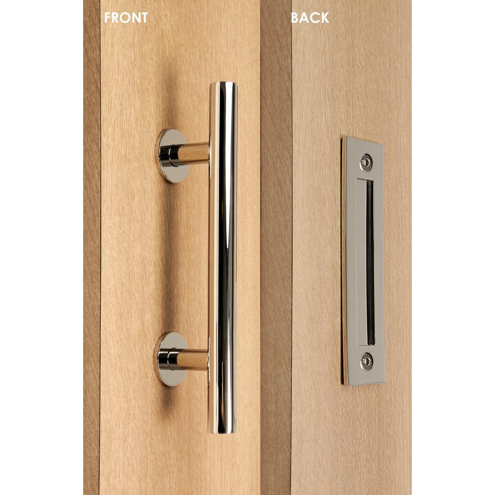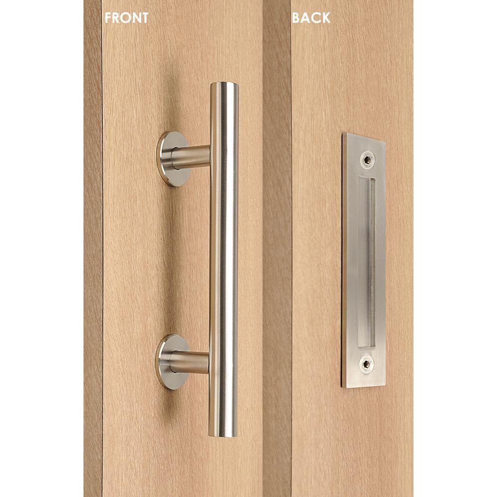 Contemporary 12 in. stainless steel square pull and flush sliding barn door handle set by STRONGAR. This decorative hardware will look stunning in any entrance, adding an elegant flare to your doorways at home or at work. Mounting hardware is included for a quick and easy installation.