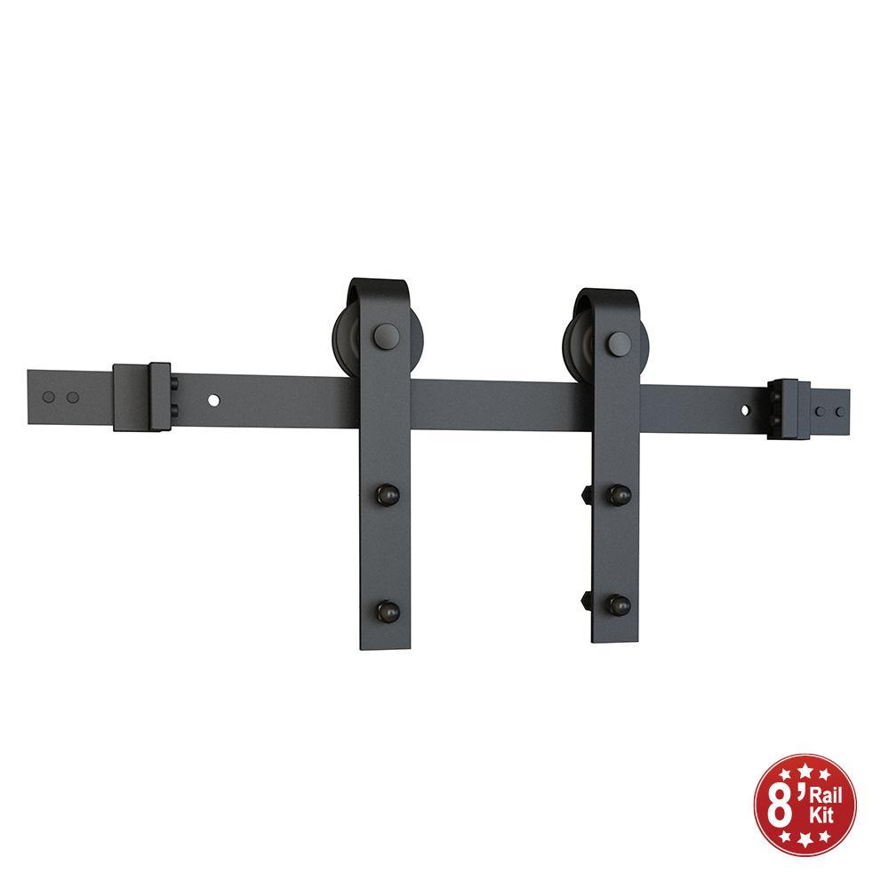 Our Solid Sliding Rolling Door Hardware 8 ft. Kit for Single Wood doors with Fittings not only looks great, it is engineered and built to rigorous standards, ensuring years of trouble free service. Manufactured using reinforced solid steel rails. American Pro Decors Sliding Barn Door Hardware can readily support amongst the heaviest sliding doors with ease. For additional durability, Sliding Door Hardware Kits employ heavy duty door rollers made of Polyoxymethylene Plastic (POM), which is a superior thermoplastic that provides smooth, whisper quiet operation. Our Rolling Door Hardware Kit for Single Wood doors meticulously combines superior, unwavering production values with exceptional functionality to yield an incomparable product that not only elegantly blends into any traditional or contemporary setting. Our Sliding Barn Door Hardware Kits are engineered and built to ensure years of trouble free operation. Easy to mount and use, our Sliding Barn Door Hardware Kit is designed to maximize the amount of usable space in any room, especially smaller rooms, which are greatly hindered by the considerable radius needed to open conventional swing out style doors. American Pro Decors Black Solid Sliding Rolling Door Hardware 8 foot Kit for Single Wood doors conveys a true sense of substantial quality and heft unmatched by lesser, mass produced counterparts and are certain to substantiate ones appreciation of the workmanship and materials used in its construction.