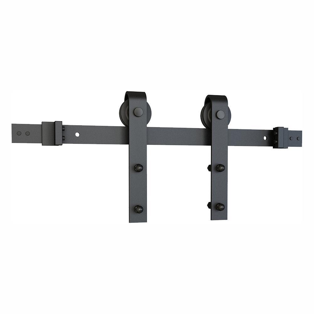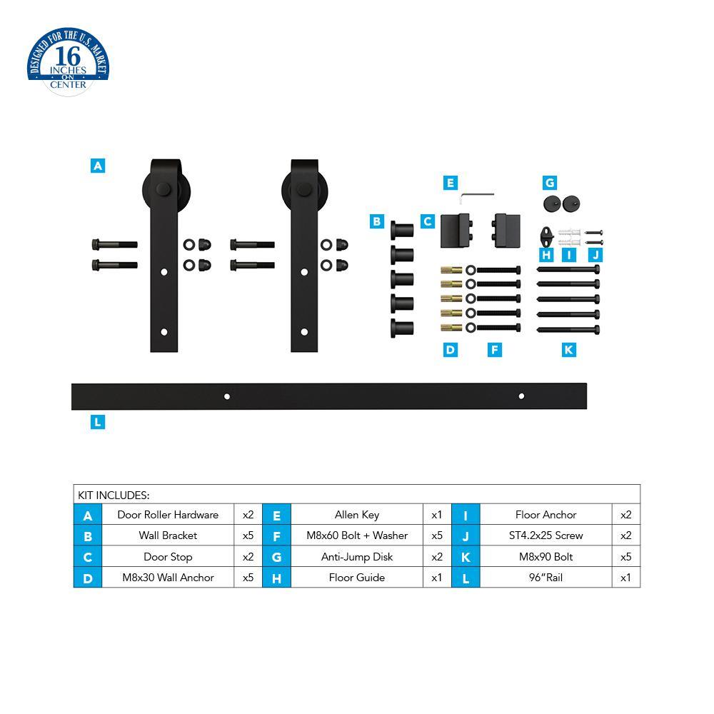 - Kit includes: 1 flat rail (96 in. x 1-1/2 in. x 3/16 in.), 2 door rollers, 2 door stops, 1 floor guide (to be routed into bottom of door), 6 wall brackets, 2 anti-jump disks and screws