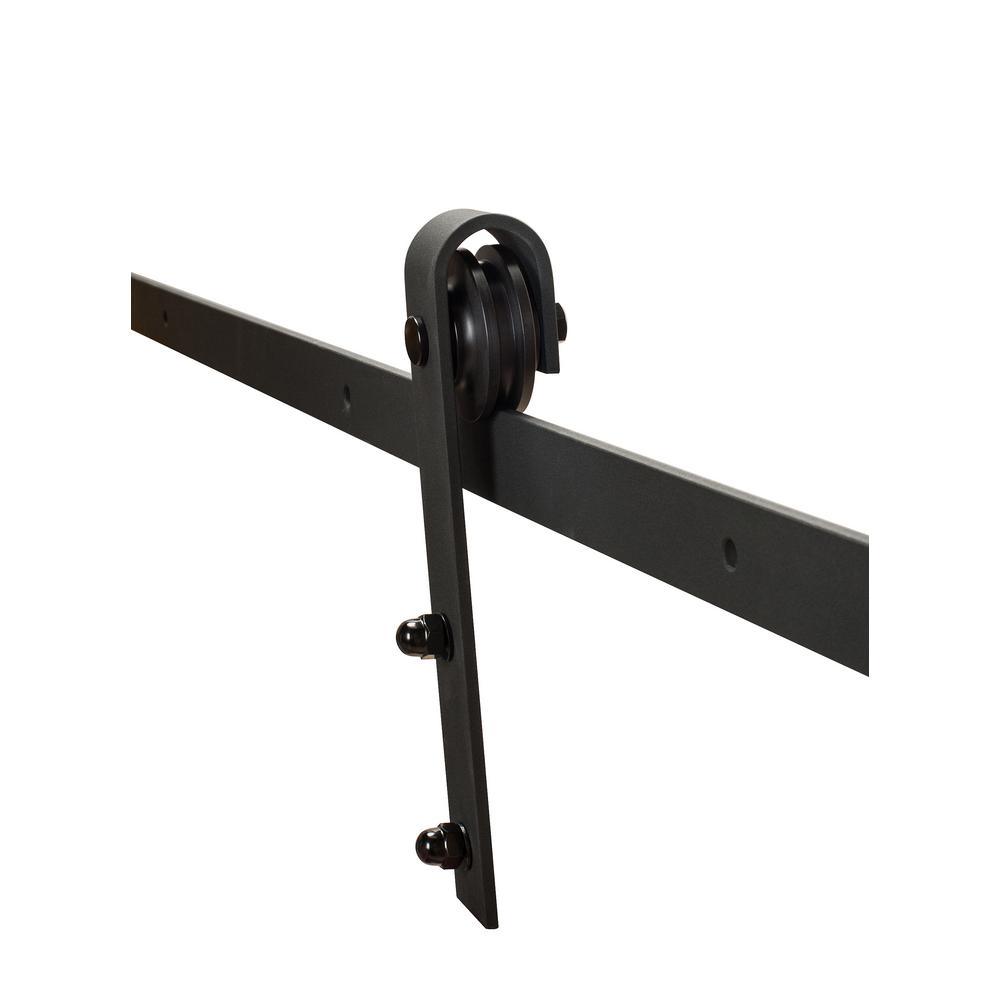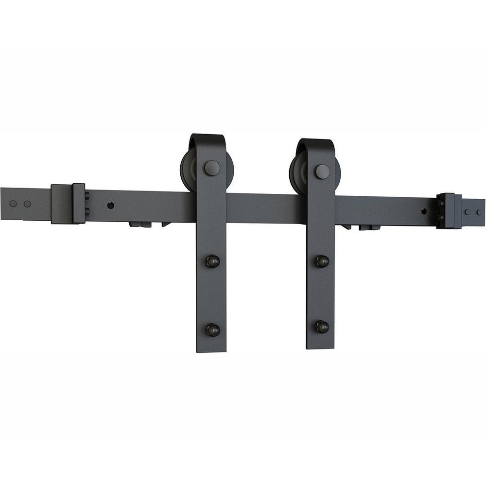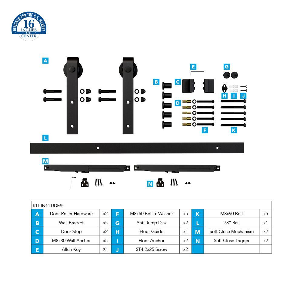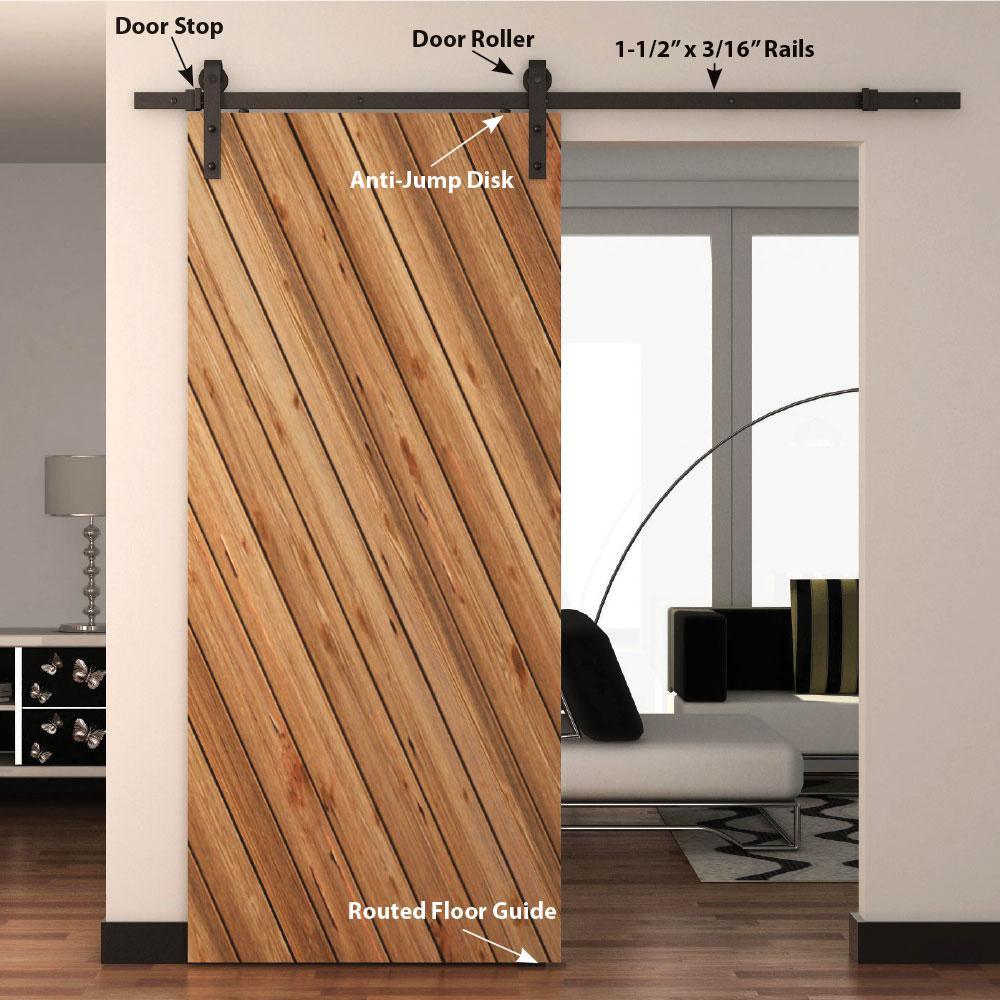 - Kit includes: 1 flat rail (78 in. x 1-1/2 in. x 3/16 in.), 2 door rollers, 2 door stops, 1 floor guide (to be routed into bottom of door), 5 wall brackets, 2 anti-jump disks and screws