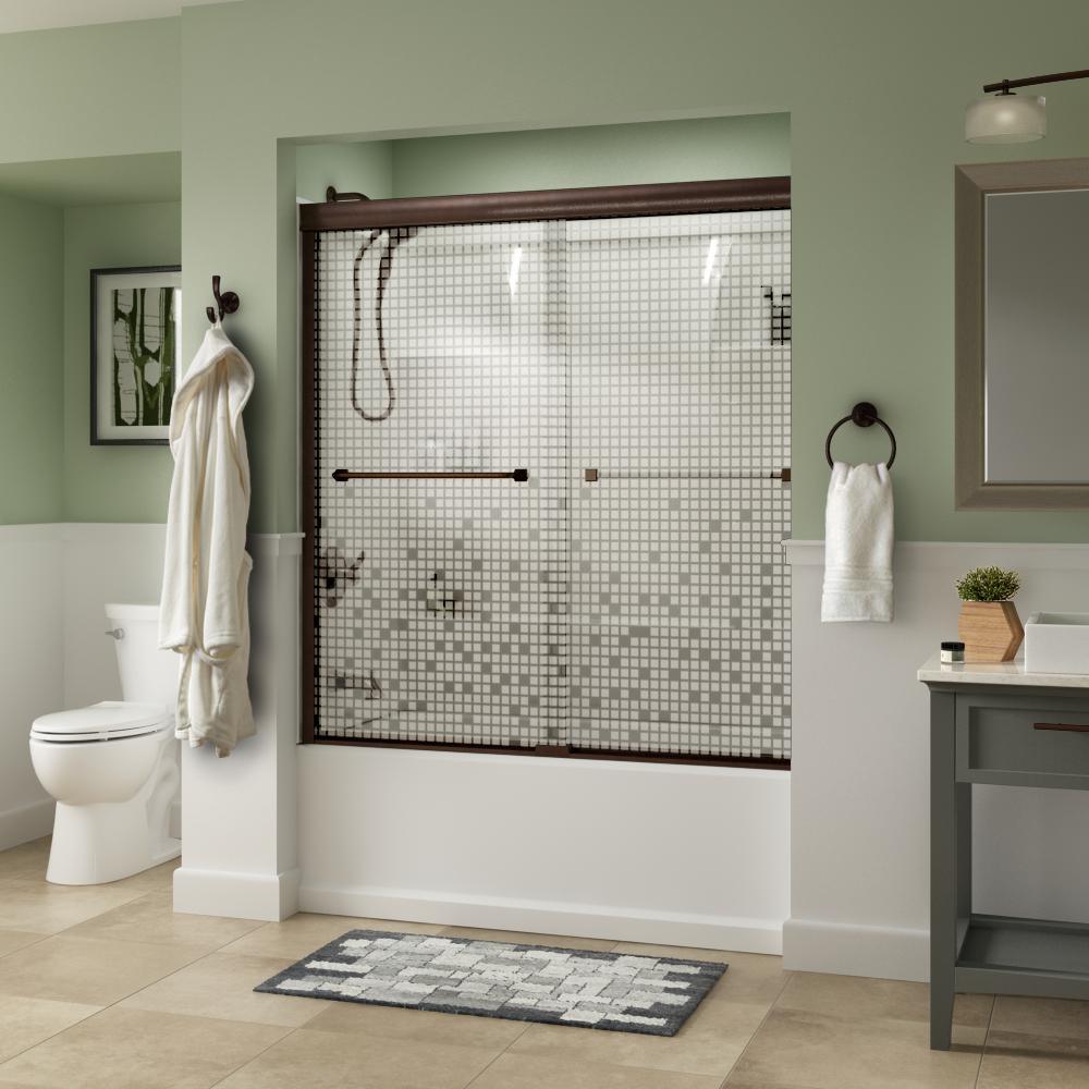 Whether you’re looking for a moderate DIY project or working on a bathroom remodel, upgrading your bathroom with a new sliding shower door is easy with the Delta 1-2-3 custom sliding shower door program. Delta’s custom glass shower door program offers 1000s of design combinations by choosing your glass shower panels, shower door track, and shower door handles to build a unique, personalized glass shower door. Simple and classic, the Traditional bathtub door track in bronze features a reversible top track with two unique profiles that offer uncompromised quality and value with a design that’s familiar and balanced. Make a statement with standard 1/4 in. ANSI certified tempered glass shower panels, featuring a textured surface that resembles water running down the panels for a spa-like feel and the most privacy. The Everly sliding shower door handles in bronze feature two convenient towel bars for extra bathroom storage in a transitional design silhouette that beautifully combines contemporary and classic qualities.