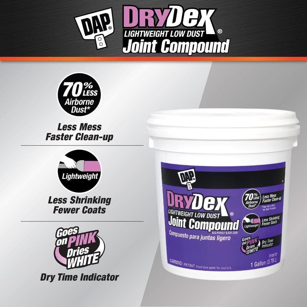 Achieve a flawless finish with the DAP DryDex Premium Lightweight Low-Dust Joint Compound. Designed for professional-quality drywall work, this compound is easy to handle, minimizes dust by 70%, and features the innovative DryDex Dry Time Indicator that clearly shows when it's ready for the next step.