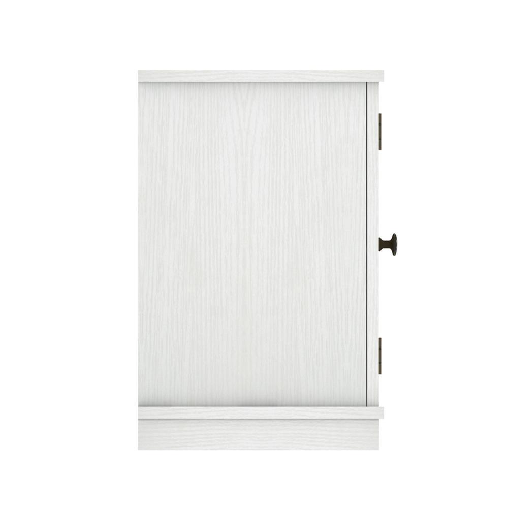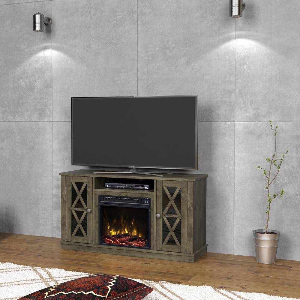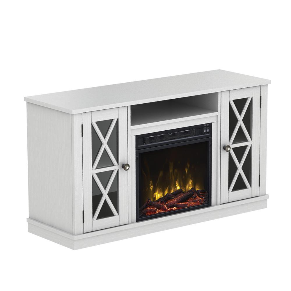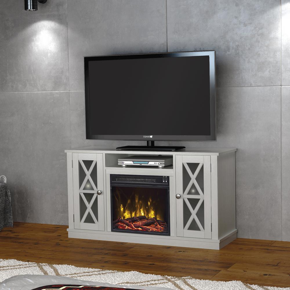 Update any room with this Bayport TV stand that accommodates most flat screen TVs up 55 in. and up to 45 lbs. The white finish and Gun Metal hardware will add a clean, sophisticated touch to your living space. Open media shelf and side cabinets hold gaming consoles, cable boxes, and media components and feature wood X mullions on 2-glass-front doors. The side cabinets include adjustable wood shelves for customizable storage and for displaying decorative items. This stunning electric fireplace provides supplemental zone heating for up to 400 sq. ft. You can activate the flame effects with or without heat to enjoy a gentle rolling fire all year long. Choose between included contemporary fire glass media or a realistic log set and ember bed to showcase the beautiful flames. The 18 in. ClassicFlame slim line insert ships as a set with this TV stand as a small parcel.