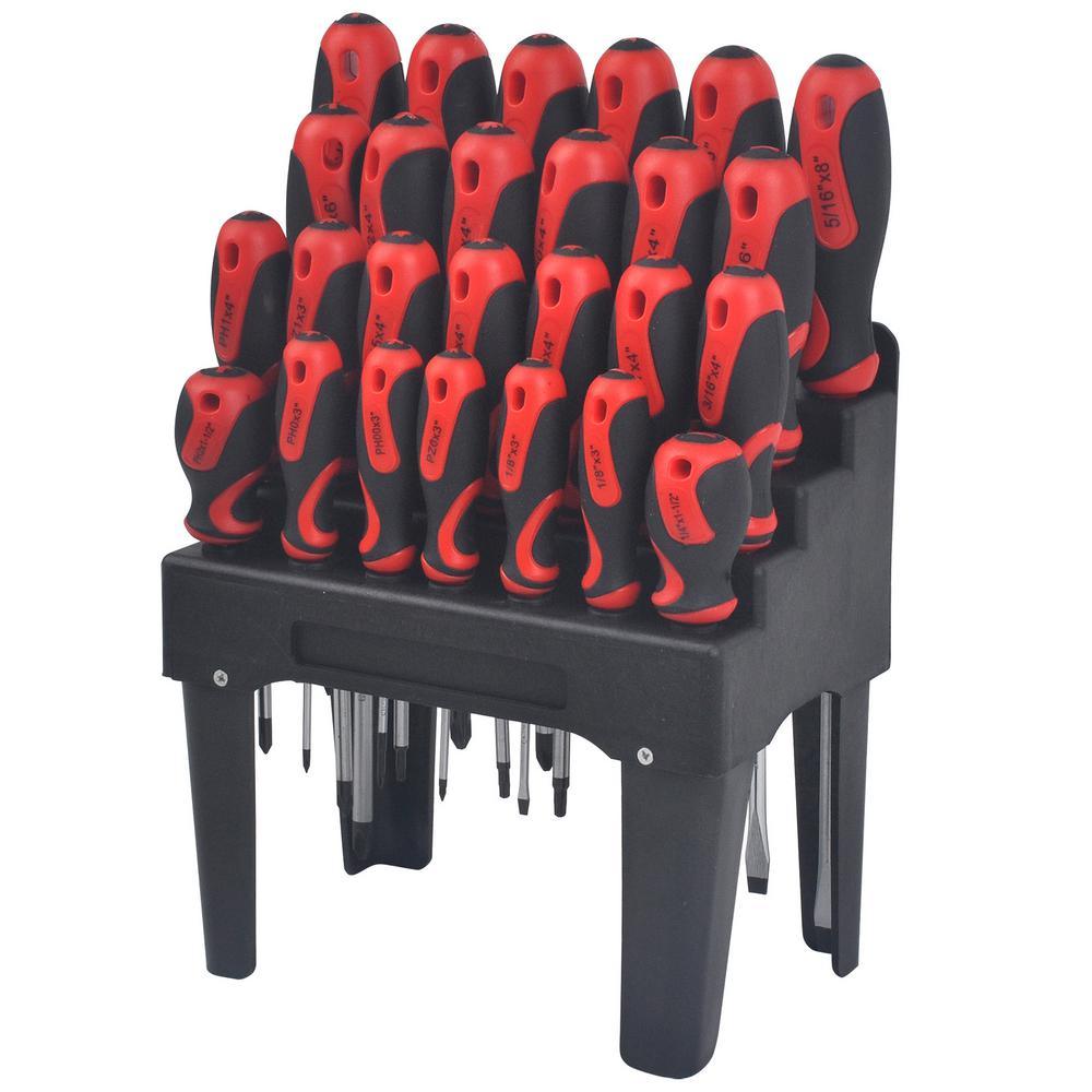 Our 26-Piece Screwdriver Set with Stand includes 26 of the Most Popular Sizes. The non-slip cushion grip handle with magnetic tips gives you better comfort for a secure hold. The set also comes with removable feet to conveniently hang on set on pegboard.