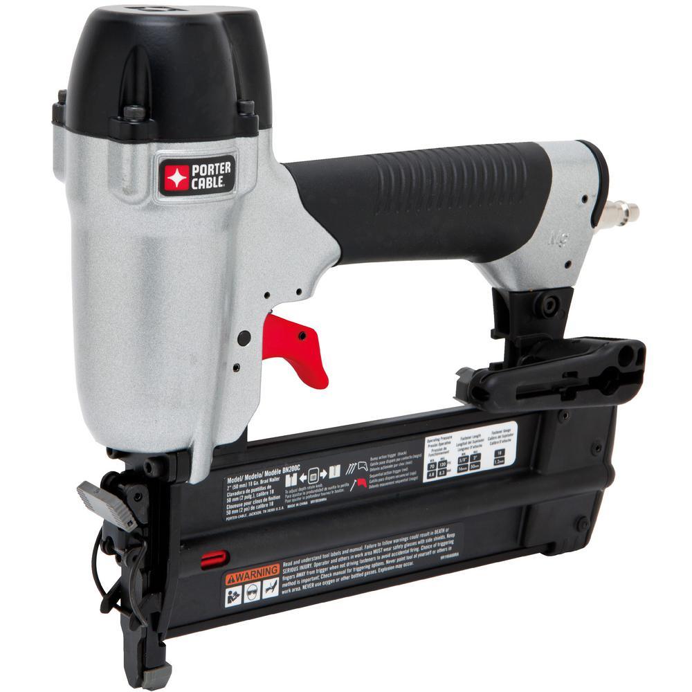 The Porter-Cable BN200C 18-Gauge 2 in. Brad Nailer Kit Drives 18-Gauge nails from 5/8 in. to 2 in. L. This brad nailer features a long life maintenance-free motor to keep from staining the work surface. Designed with a magnesium body for strength and lightweight use. The kit includes nails of 1-1/4 in., carrying case, removable non-marring nose tip and owner's manual. For a limited time get a bonus 23-Gauge 1-3/8 in. Pin Nailer with purchase.
