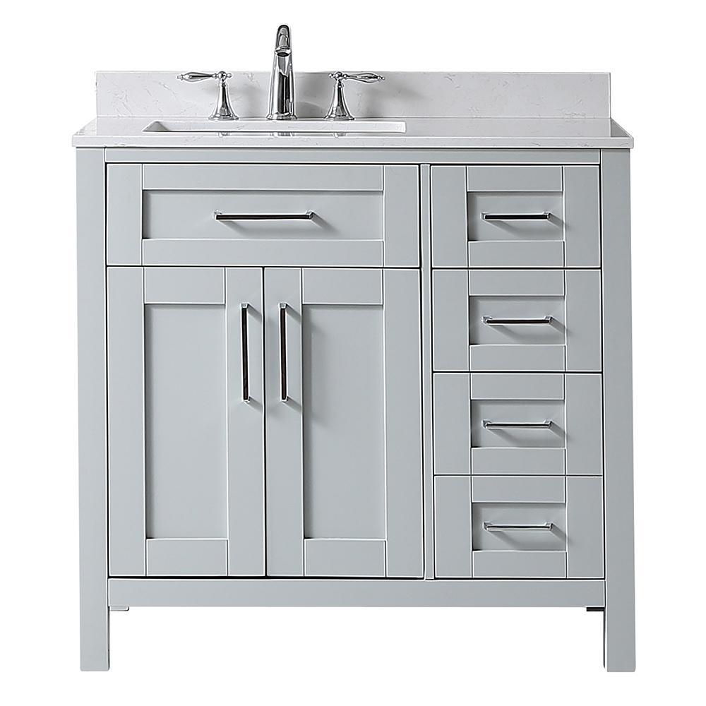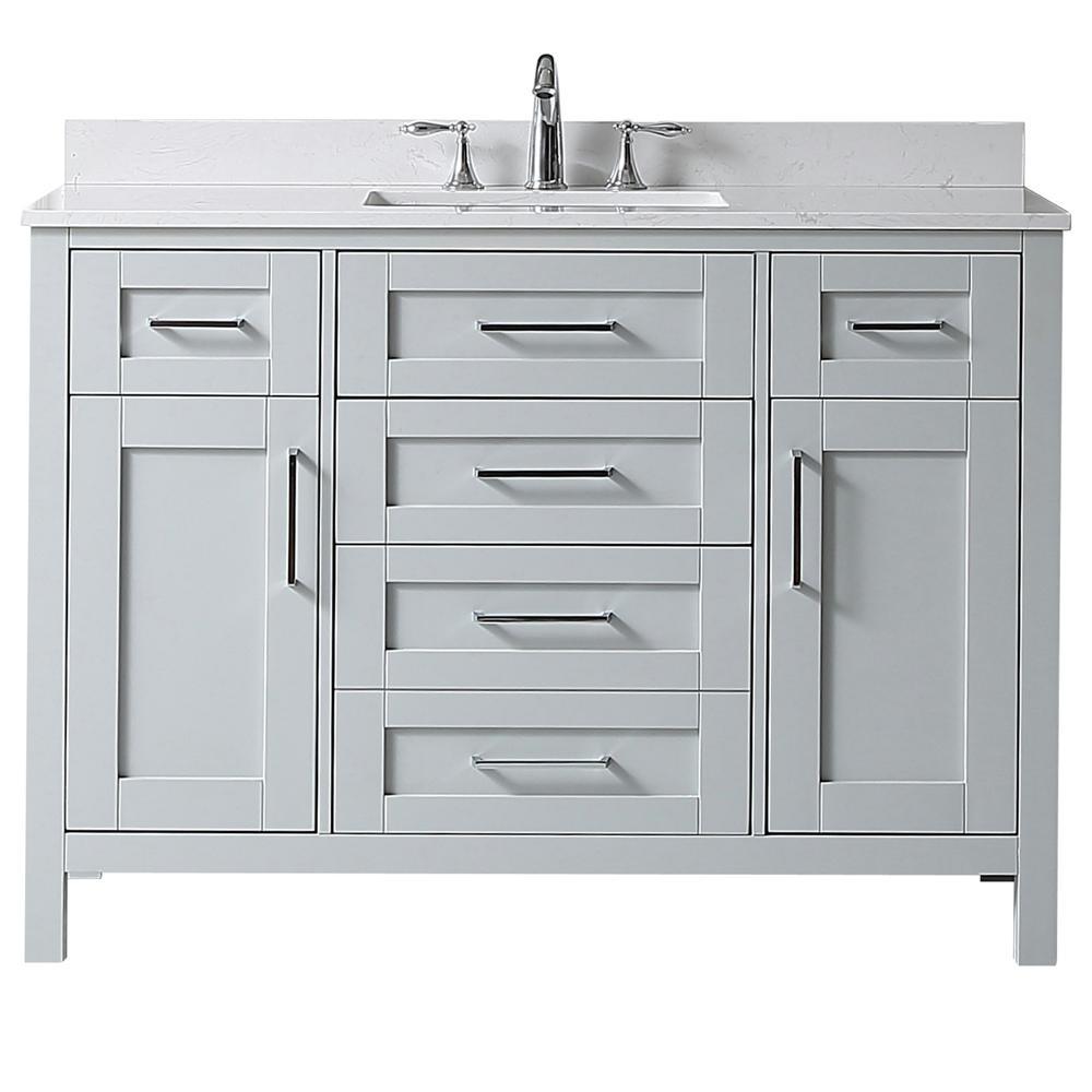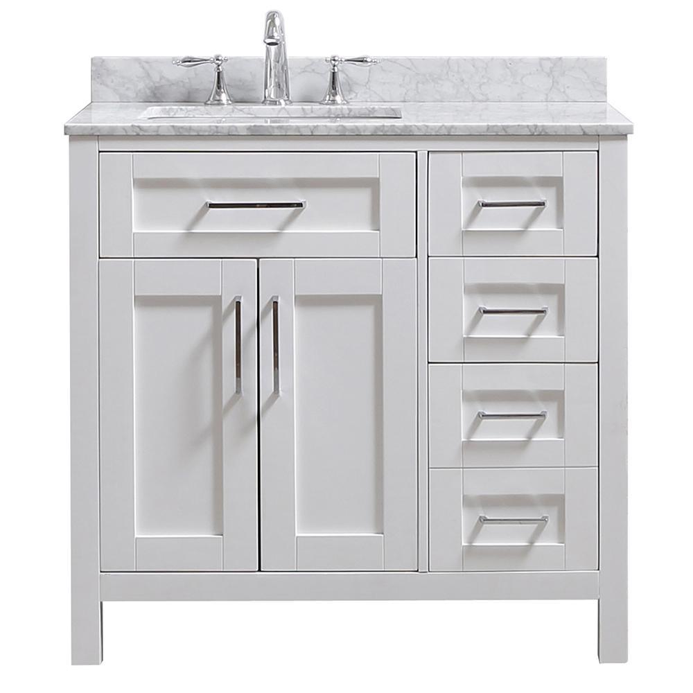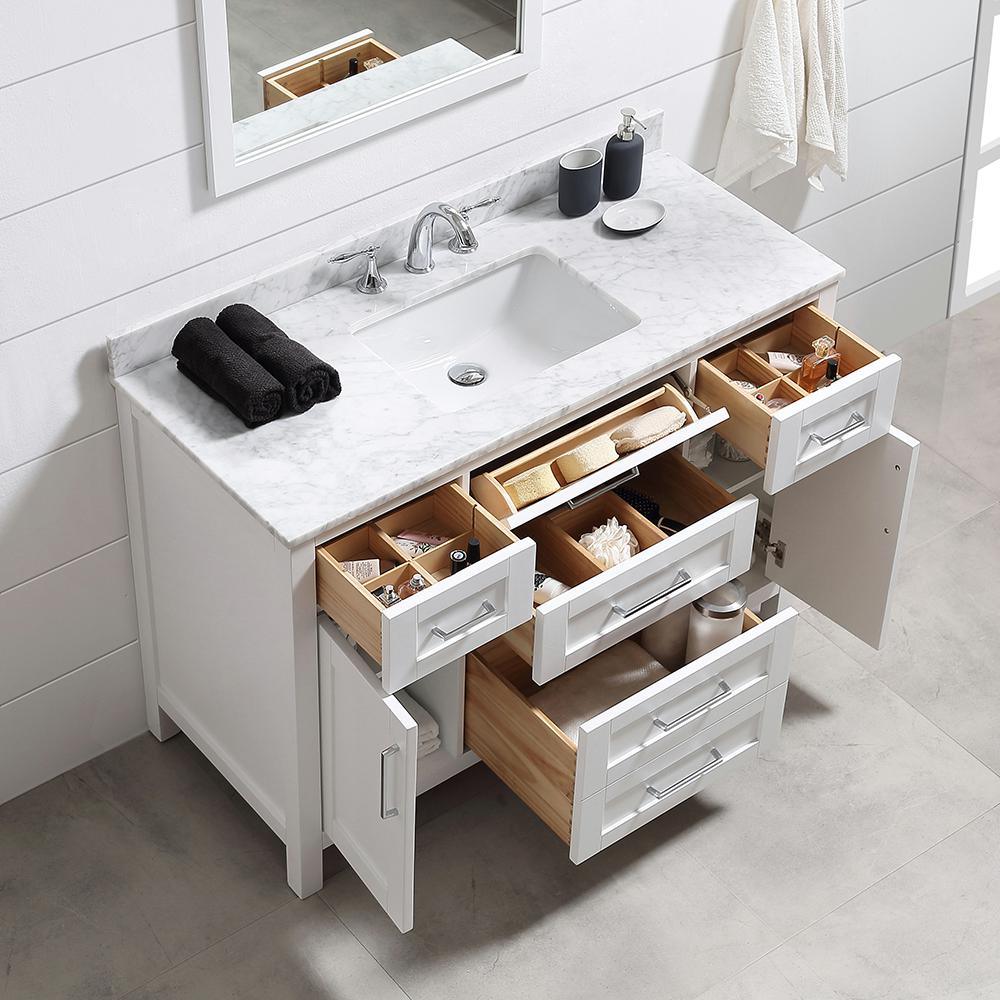 The Riverdale vanity, available in pure white and dove grey finishes, exemplifies elegant simplicity. Its drawers boast integrated organizers and a convenient tilt down front drawer. With soft close hinges and sleek chrome pulls, this vanity is a sophisticated addition to any bathroom. The vanity's Carrara Marble top and under mount ceramic sink are both functional and stylish, and the piece comes assembled with a 1 year warranty. It features 1 drop-drawer, 1 deep drawer, and 2 regular drawers, as well as adjustable drawer dividers and a 20 in. rectangular basin. Its timeless design and quality craftsmanship make it an excellent choice for any home.