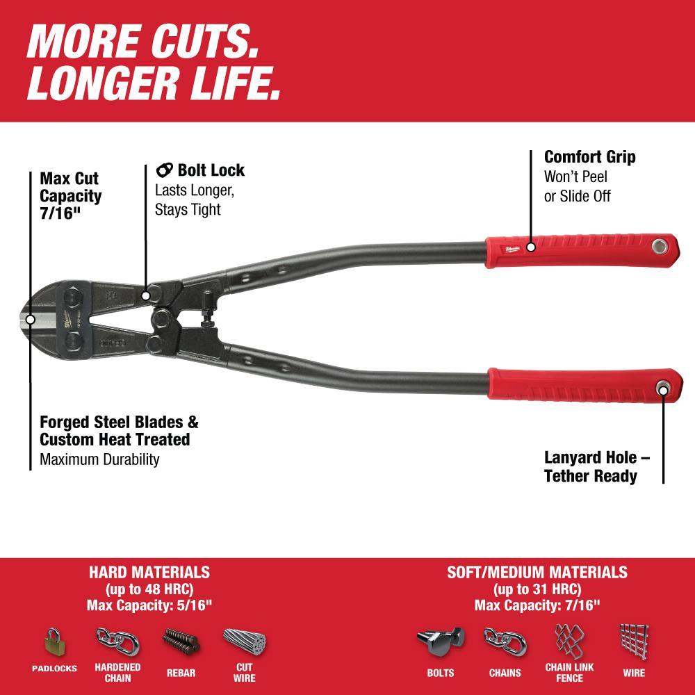 The MILWAUKEE 24" Bolt Cutter features optimized Forged Steel Blades custom heat-treated to provide maximum durability. Bolt Lock secures the pivot bolts to prevent loosening. The bolt cutter handles feature Milwaukee comfort grip that won't peel or slide off. The 14" bolt cutter has adjustable blades and integrated lanyard holes in the handles for easy tethering.