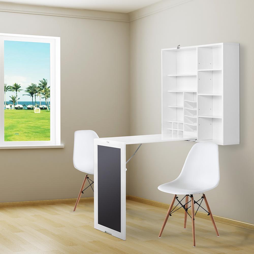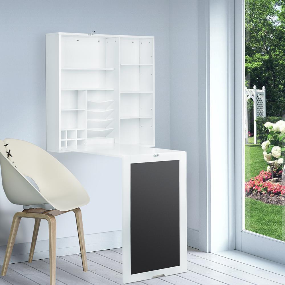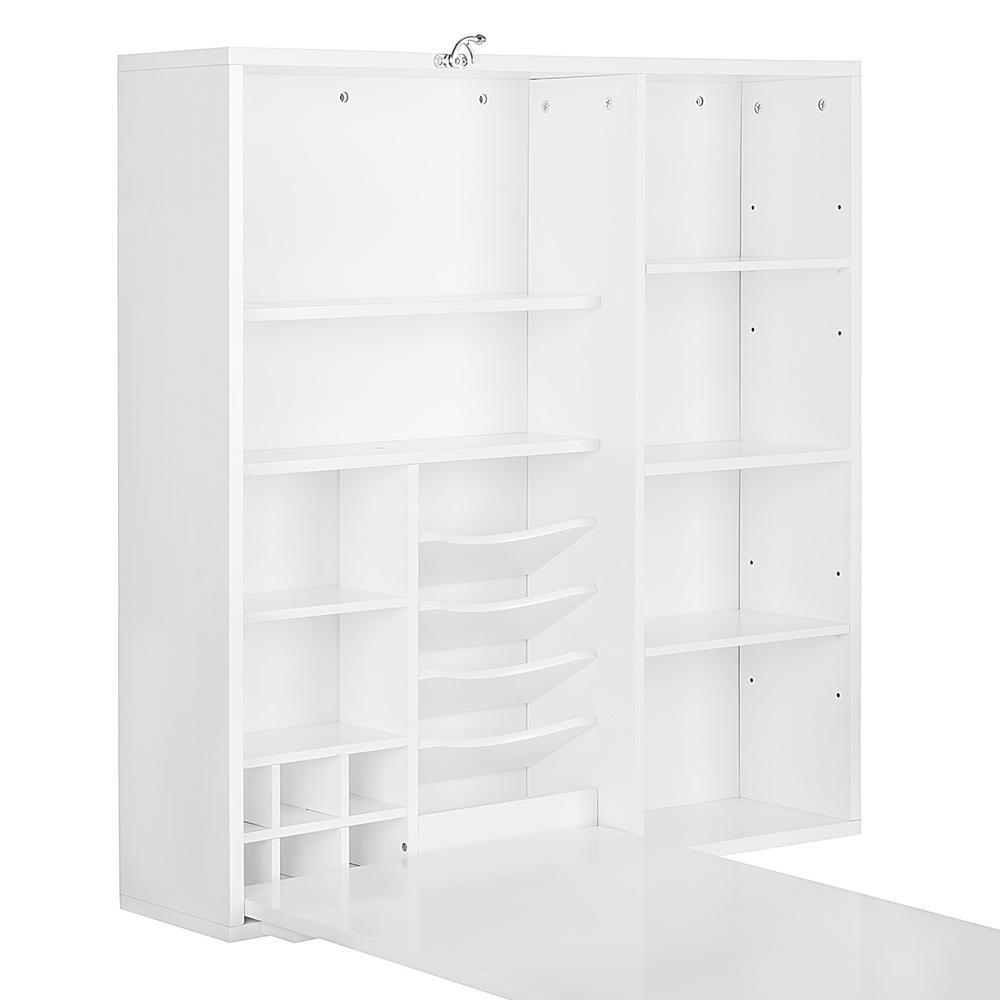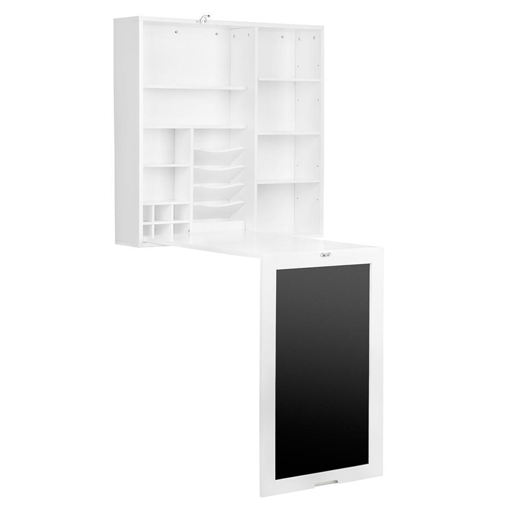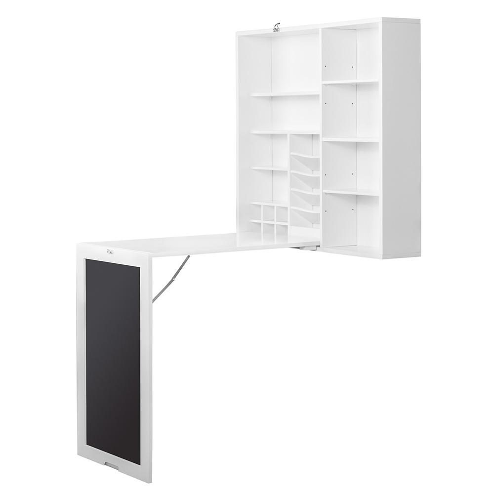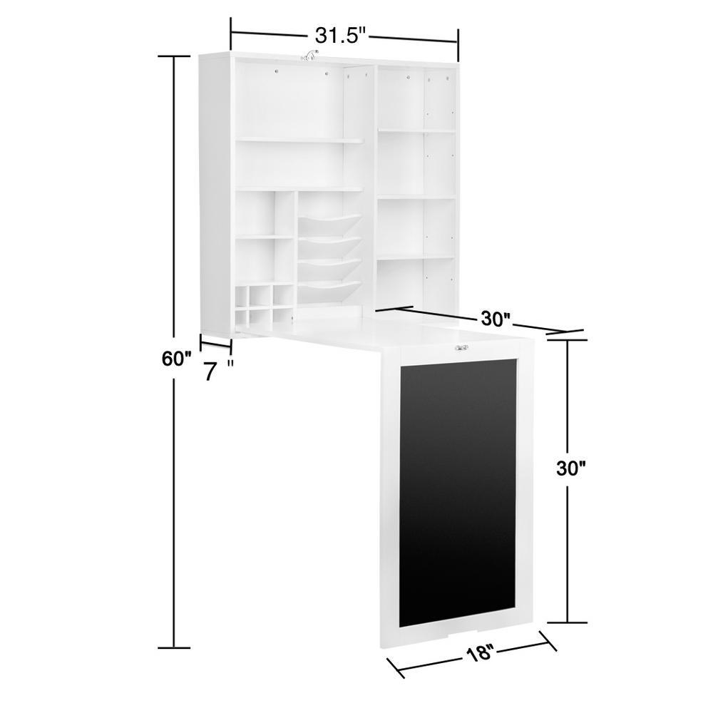 The Utopia Alley fold-out wall mount desk with storage cabinet and shelves in white, adds storage, style, and saves space in your kitchen, bedroom, and more. This mountable wall cabinet with a stylish chalkboard front easily folds out (Murphy bed style) and converts into a convenient workspace that is perfect for your computer usage, scrapbooking, crafting, sewing, paying bills, homework and so much more. It also can be used as a bar or serving table when you have company. The cabinet chalkbaord door when opened, has multiple storage units to keep your belongings in an organized space. Also includes side shelves for extra storage if needed.