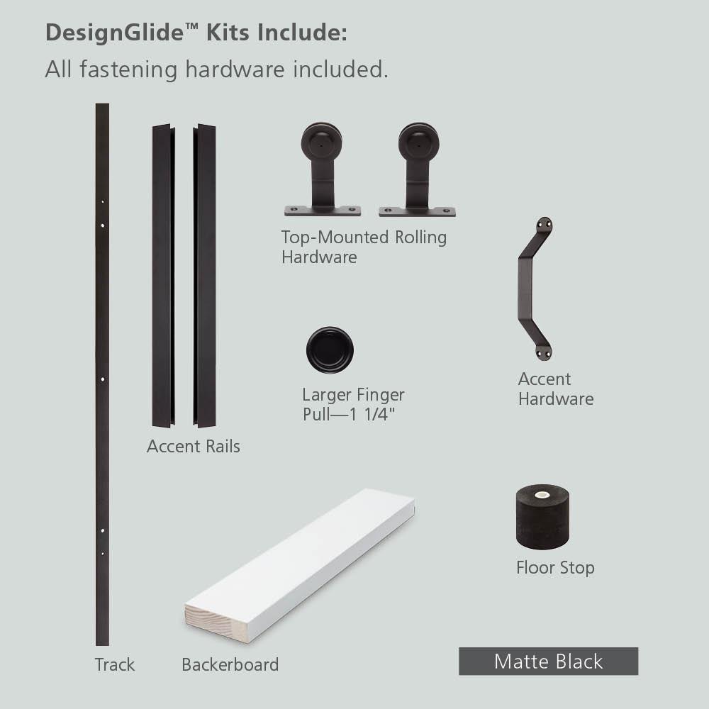 • Kit includes: top-mounted rolling hardware, accent rails, track, larger finger pull (1-1/4 in.), accent hardware, backer board and floor stop