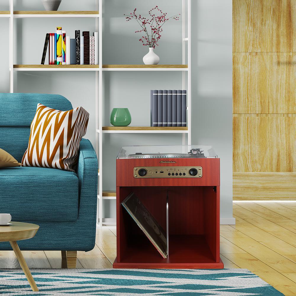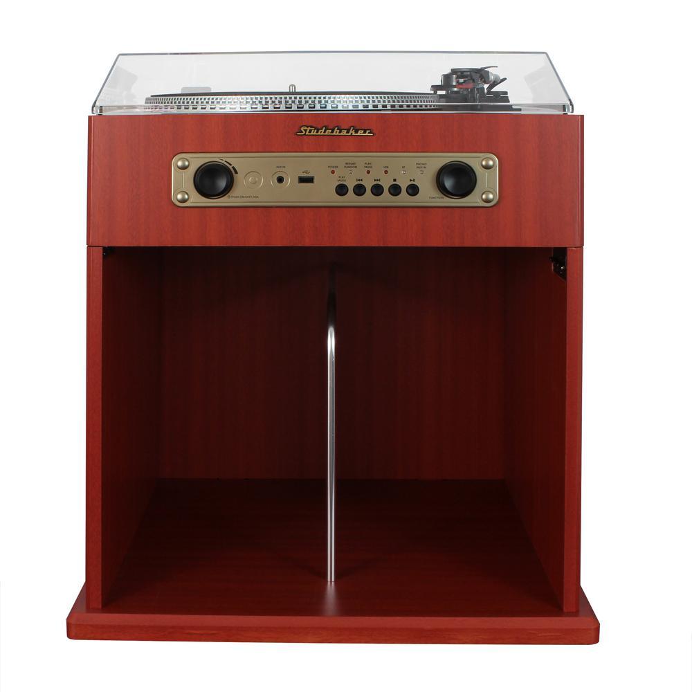 Play and store your vinyl music collection with this Studebaker 3-speed stereo turntable with Bluetooth receiver and record storage compartment. This turntable will full size platter and auto-return features built-in speakers so it works as a stand-alone music system. You can also wirelessly stream your music from any Bluetooth enabled device. This belt-driven unit is versatile enough to play all three common speeds (33 1/3, 45 and 78 RPM) so you're not restricted to any one part of your record collection. The spacious record storage compartment enables you to keep your favorite albums safe and close at hand. In addition, the classic, nostalgic cabinet features an auxiliary input jack that allows you to connect to your iPod, MP3 player or any other digital audio players. There is also a USB port for music playback from a flash drive. The unit operates on 120-Volt AC and includes a dust cover for protecting the turntable when not in use.