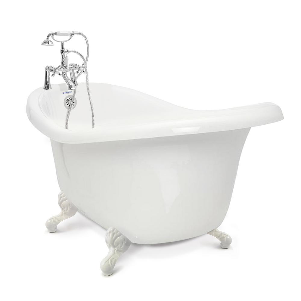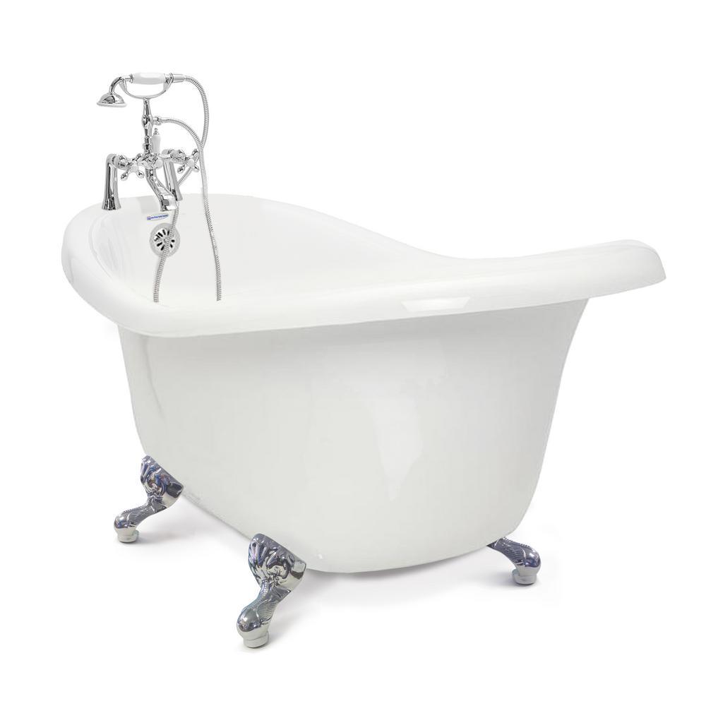 American Bath Factory presents the Chelsea Slipper Claw Foot Bathtub Packages. We offer the tub only or the complete kit which includes everything you need to transform your old bathroom from ordinary to extraordinary. The Chelsea Slipper tub is made from our proprietary material we call AcraStone, resulting in a bathtub to be beautiful and dependable for years to come. AcraStone is strong, thick and warm to the touch with a smooth porcelain like finish. The Chelsea Slipper bathtub features hand-cast metal Imperial claw feet that are available in White or you may upgrade to 3 other metal finishes (CH, SN or OB). The gentle slope allows the bather to recline comfortably for a more relaxing soak. The tub is lightweight but strong which makes this perfect for your second story bathroom. Our tubs come backed with our Limited Lifetime Warranty. Size: 60 in. L x 32.5 in. W x 29.5 in. H soaking depth: 17 in. gallons: 40Material: Acrastone is strong (chip/wear resistant) with a porcelain-like surface Bathtub is pre-drilled for faucet. This is the Chelsea Slipper Clawfoot Bathtub Package C-OB which includes the 5 ft. Slipper tub with Old World Bronze Metal Imperial Feet, F900A Deck Mount Faucet, F1100 Straight Supply Lines and F5714 Waste and Overflow Tip Toe Drain in Old World Bronze.
