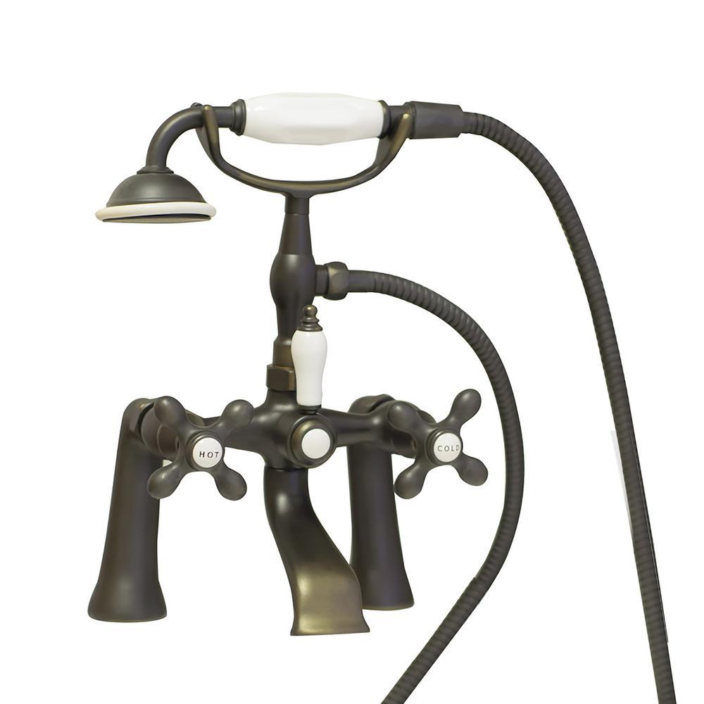 • Includes F900A deck mount tub faucet with hand shower and metal cross handles, straight supply lines and a waste and overflow with a tip-toe push drain in old world bronze metal finish