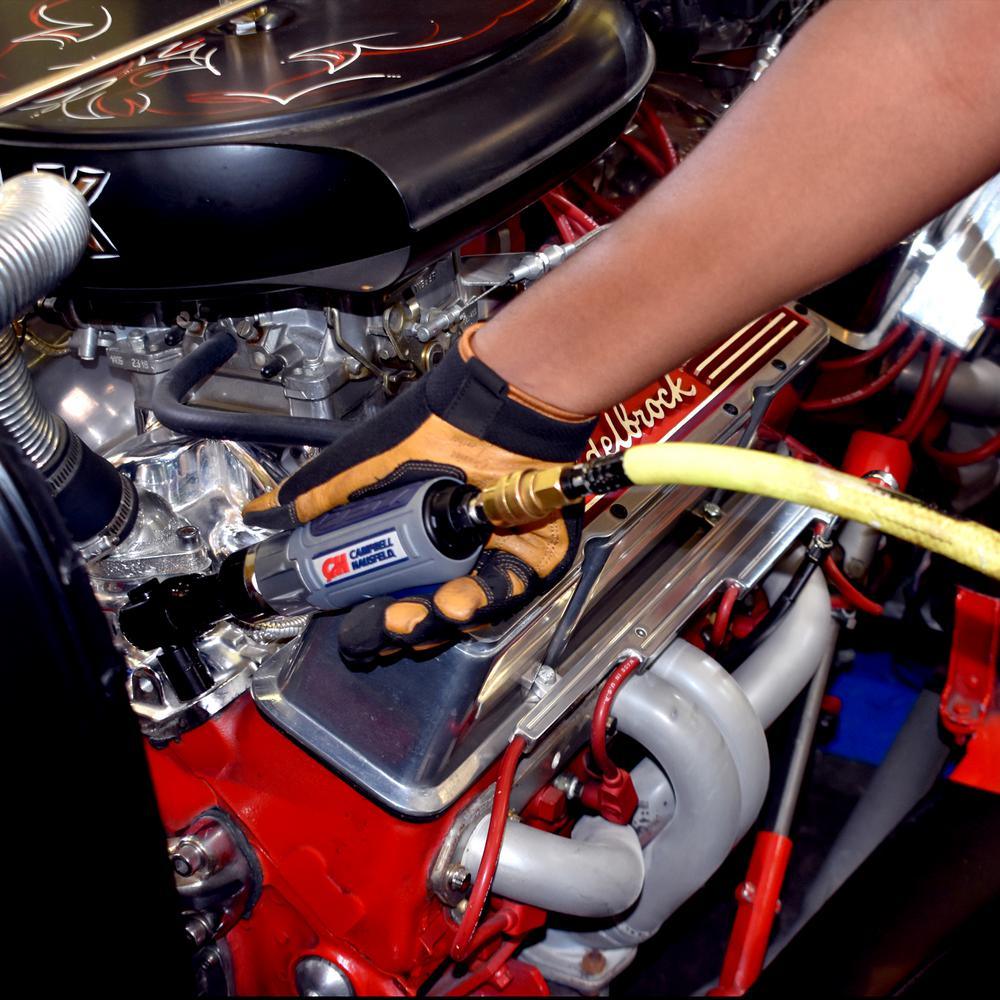 The Campbell Hausfeld Get Stuff Done 3/8 Air Ratchet with Shock Absorption (XT051000) is the tool when you need power, control and the ability to work in a confined space. The conveniently placed trigger creates a user friendly mechanism to get stuff done. The shock absorbing feature means no more knuckle busting as the clutch internally absorbs the impact instead of transferring it to your hand/wrist. Just to prove that we understand your requirements, this trigger mechanism is designed to extend your reach and activate in super tight places making the XT051000 the ideal ratchet. boasts a durable composite housing material for a longer product life. Anvil length of 3/8 in., working torque of 0-50 ft. lbs., maximum torque of 75 ft.lbs., impact speed of 1,600, RPM of 320, average air consumption of 1.9 CFM at 90 PSI, in. NPT (F) air inlet, 3/8 in. minimum hose size. A 4 gallon compressor and PSI of 90 is recommended. Get Stuff Done faster and easier with Campbell Hausfeld The Air Power Expert.