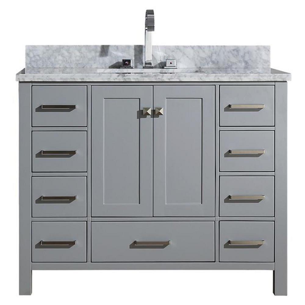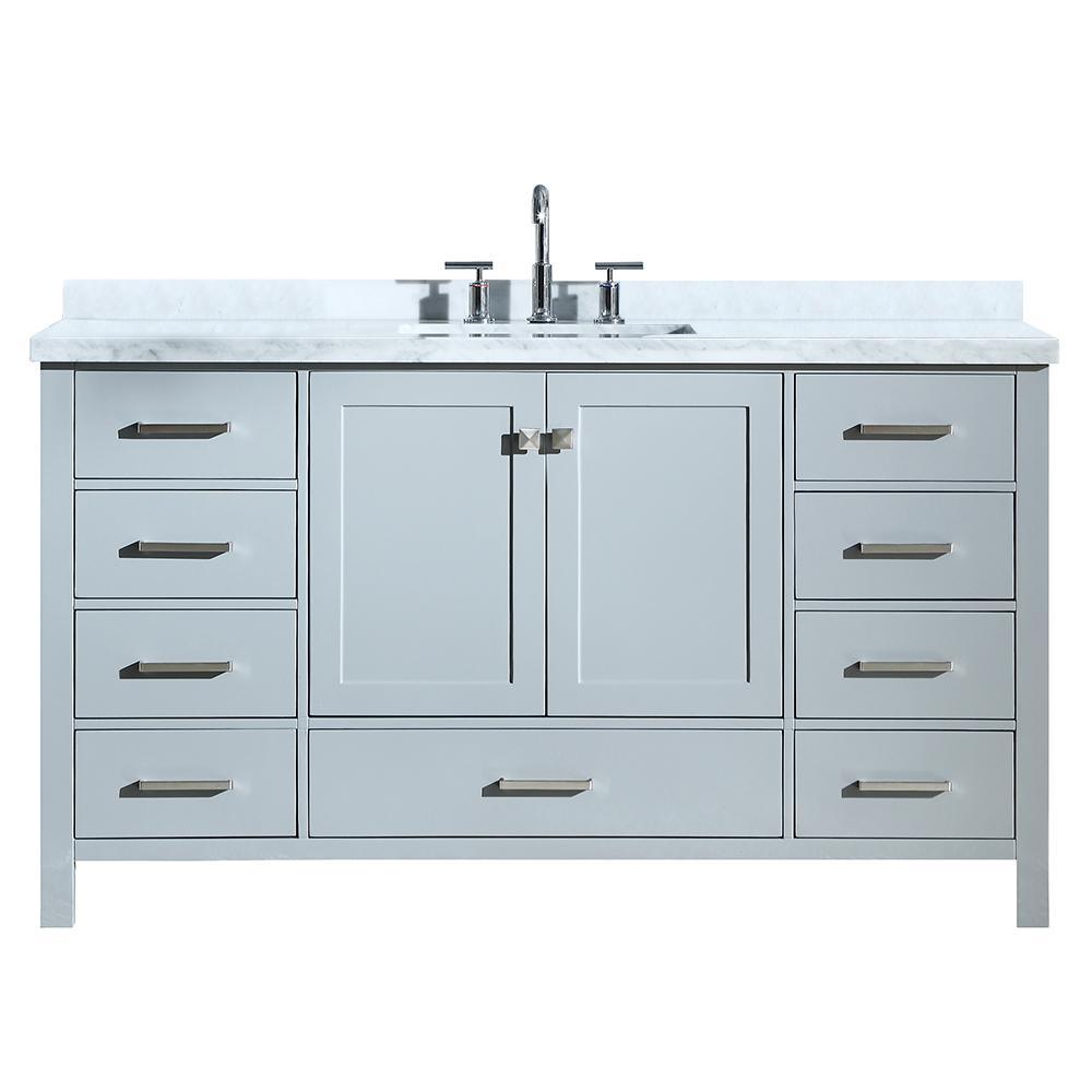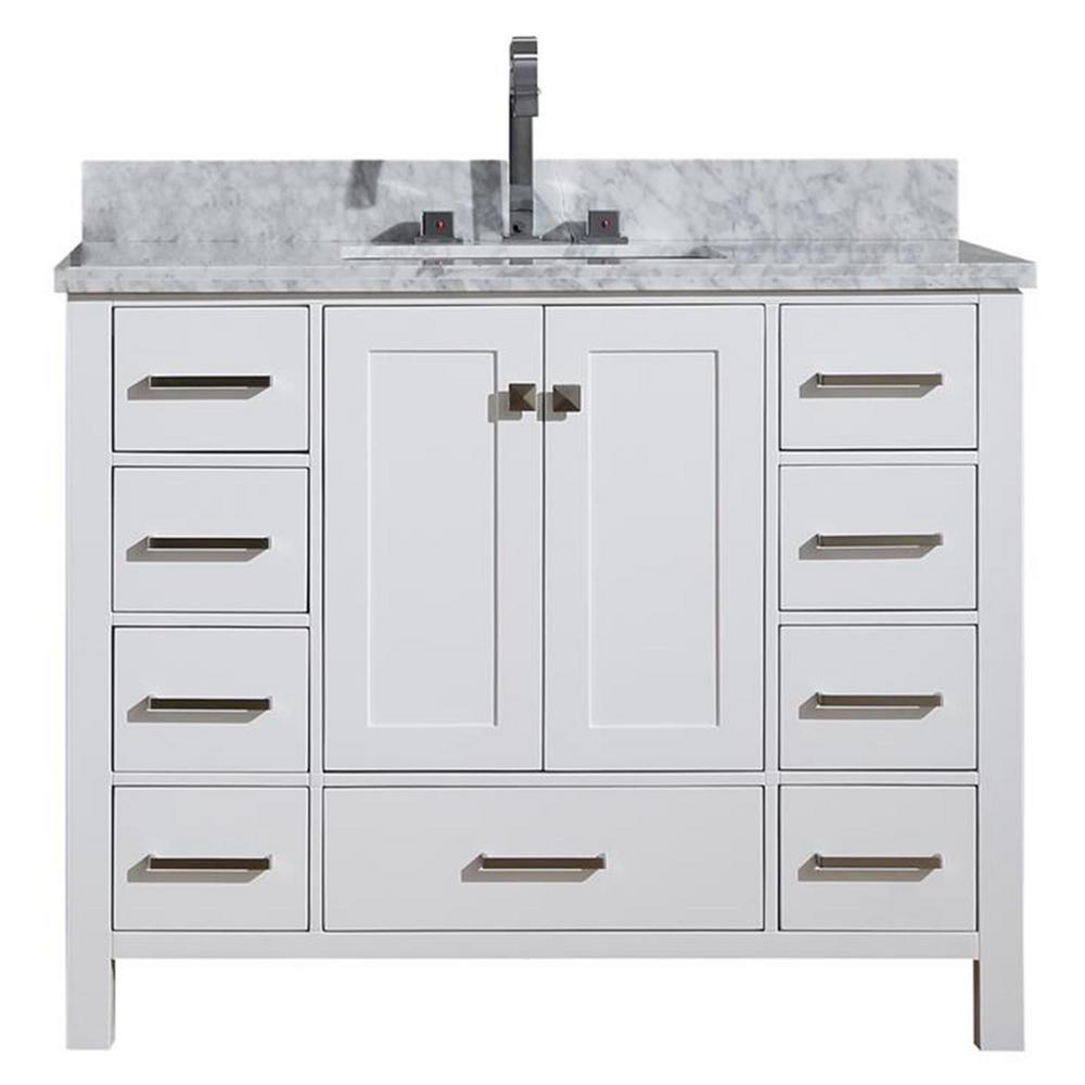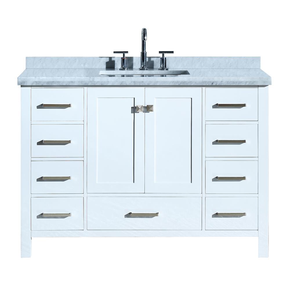 The Cambridge series from Ariel Bath is the perfect choice for those looking for a modern bathroom vanity. The Cambridge is available in single or double sink models with under-mount, ceramic sinks included. These elegantly constructed units are topped with Carrara white marble countertops and equipped with Satin nickel finish hardware.
