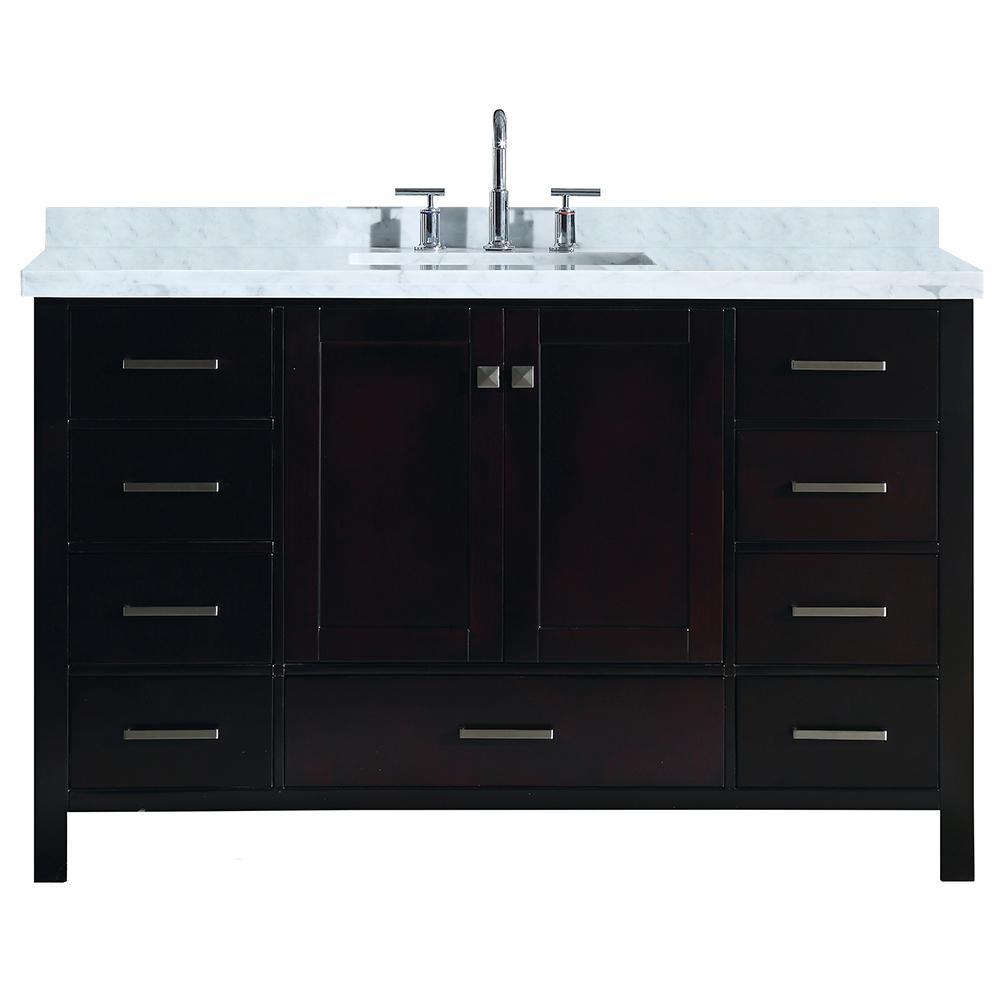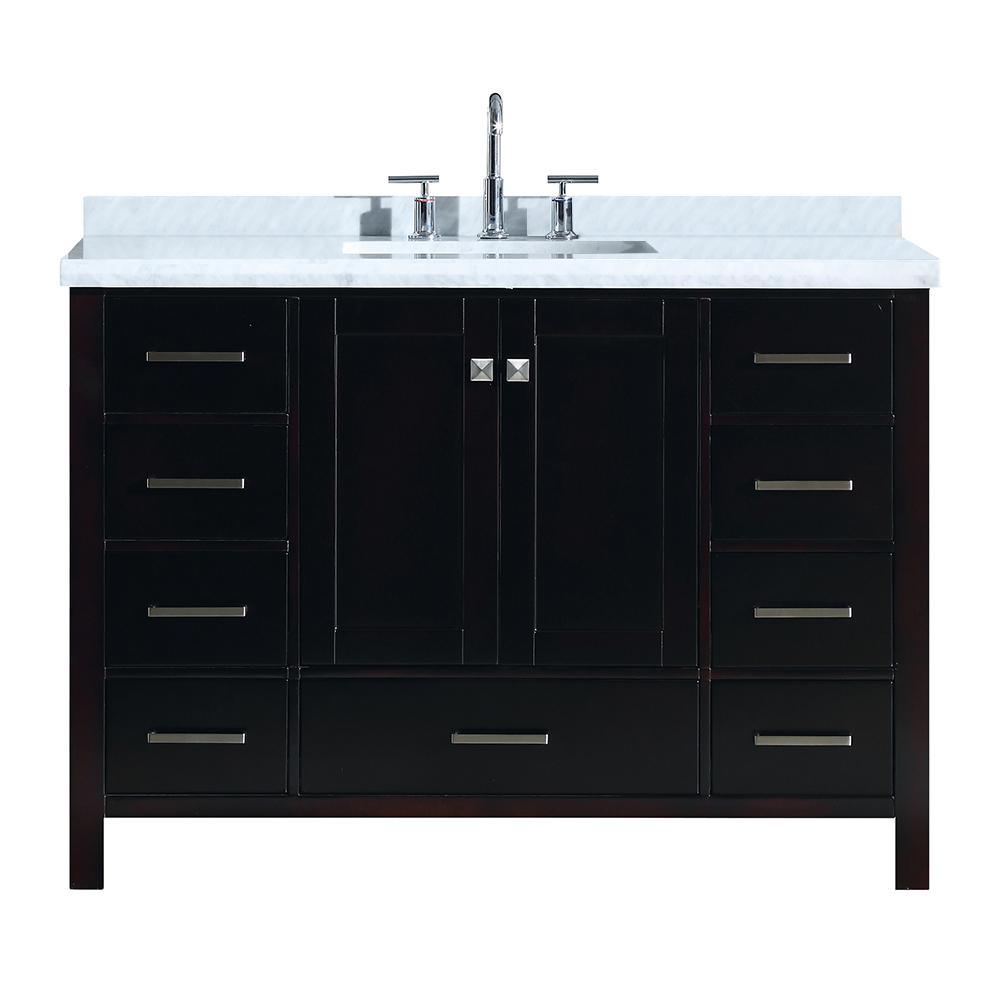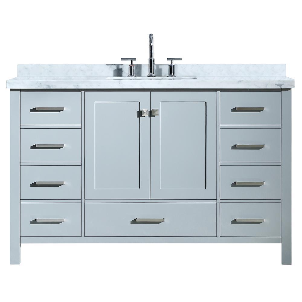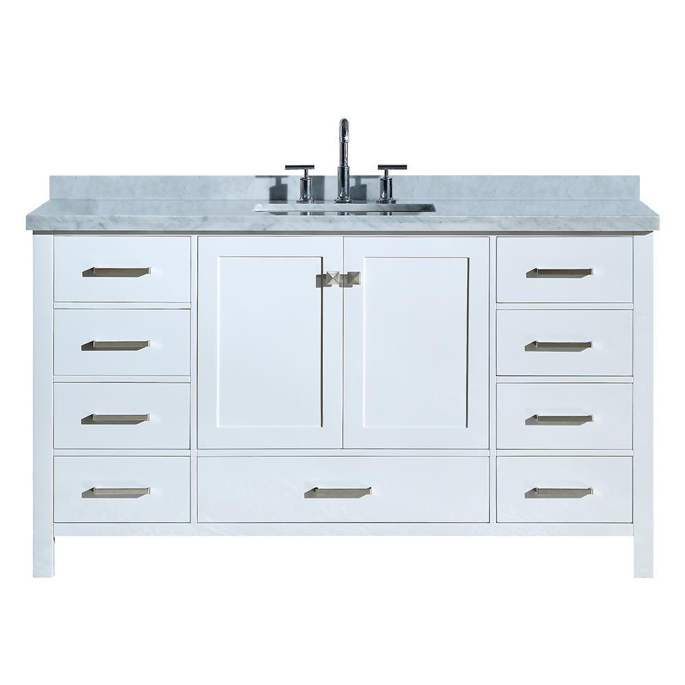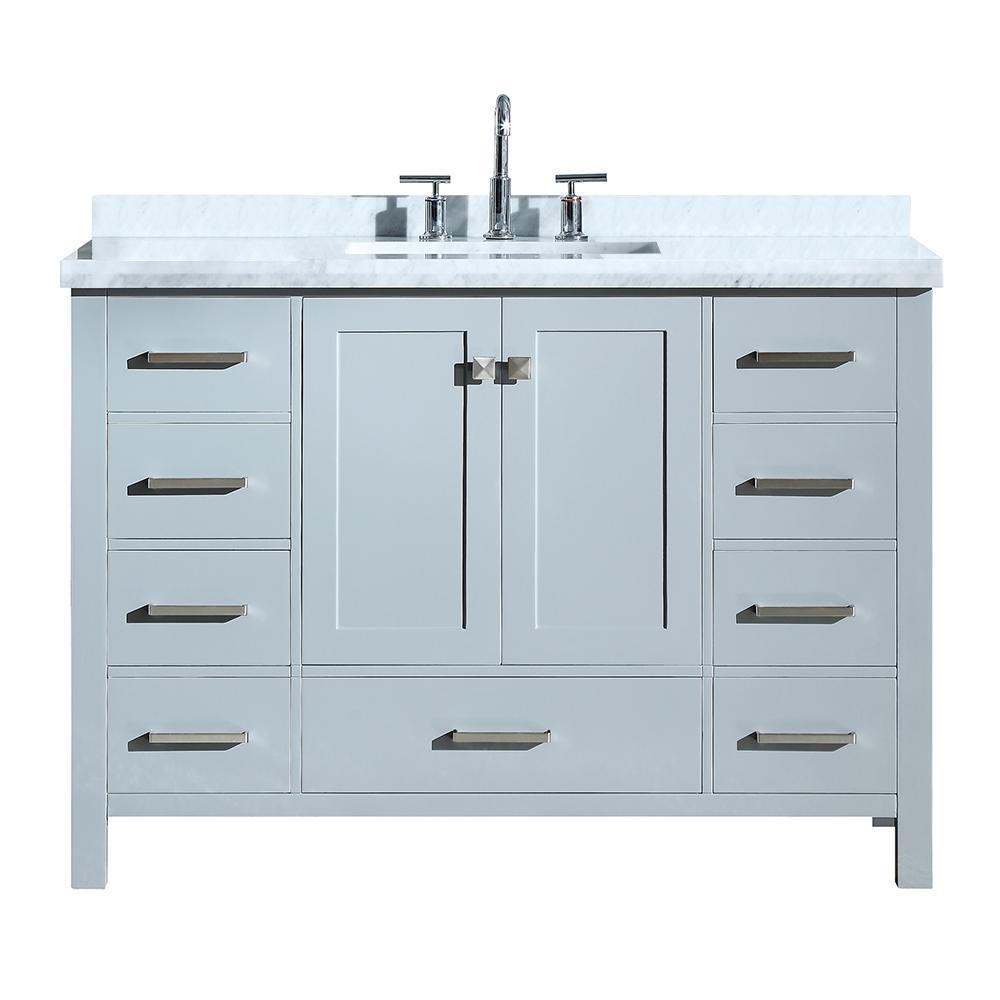 The Cambridge series from Ariel Bath is the perfect choice for those looking for a modern bathroom vanity. The Cambridge is available in single or double sink models with under-mount, ceramic sinks included. These elegantly constructed units are topped with Carrara white marble countertops and equipped with Satin nickel finish hardware.