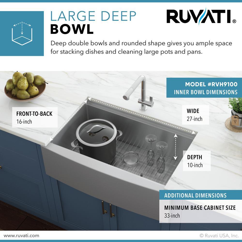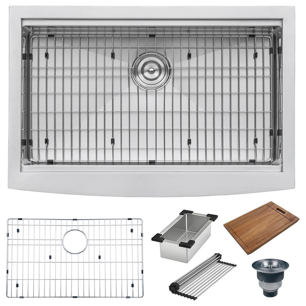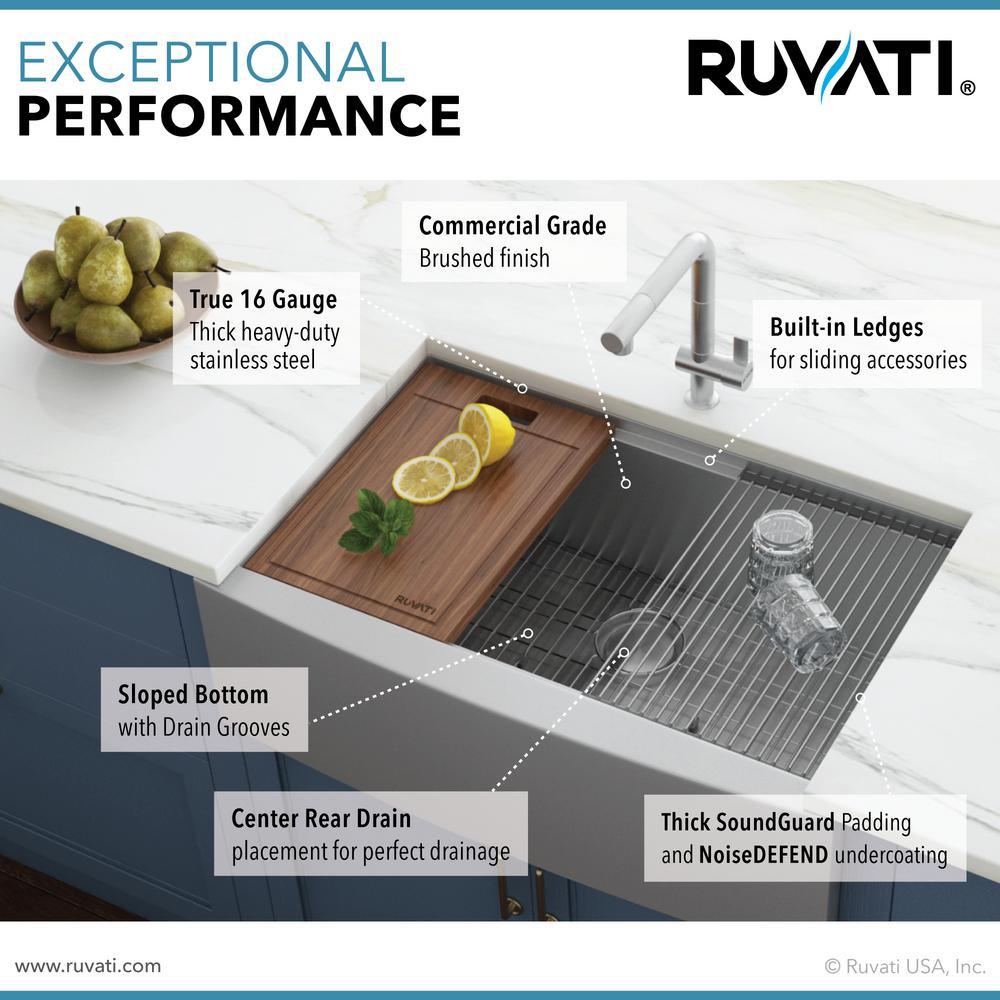 This Workstation APRON-front sink from Ruvati's Verona series combines the best of both world: a bold stainless steel apron-front with a functional workstation: built-in accessories (colander, cutting board and roll-up rack) that slide on the integrated tracks in the sink. Includes a deep stainless steel colander that you can use as strainer. The solid hardwood cutting board is constructed of sapele wood (African Mahogany)-a luxurious wood that has a beautiful finish and handles water well. The roll-up rack, made of stainless bars held together with flexible silicone, rolls out on the track and is ideal as a dish drying rack. Ruvati's Verona apron-front turns your sink into a complete work space-you can do all your prep work right on top of your sink, and keep your countertops clean and free of mess.