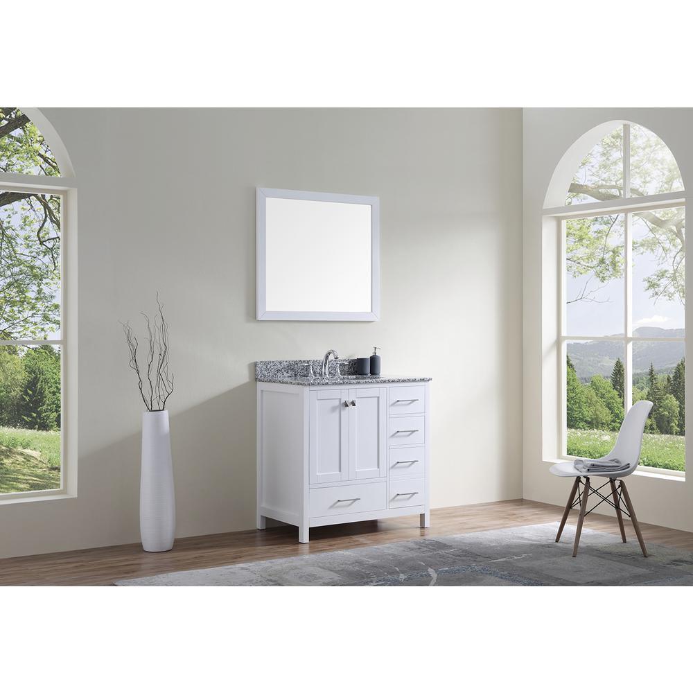 The Caroline Madison series brings striking design to any master bathroom with its crafted modern lines, paired with a gorgeous textured arctic white granite countertop with obsidian and beige accents. The vanity cabinet is made with a strong solid wood frame and features a large upper double door storage and three sliding drawers, all pre-installed with soft-closing technology. Brushed nickel door and drawer hardware and a matching framed mirror complete the look of the marvelous Caroline Madison.