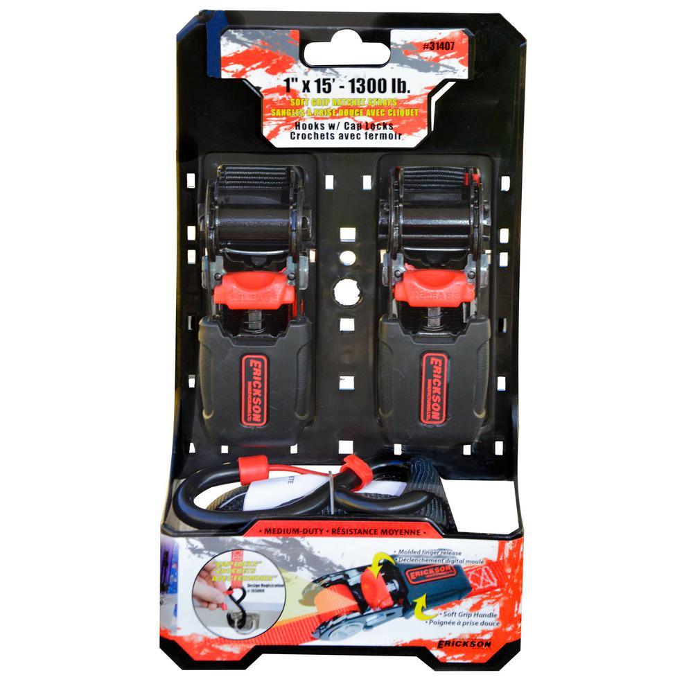 Erickson 31407 contains two (2) soft grip ratchet straps with cap locks. Rated for 1300 lbs each, these medium-duty durable ratchet straps are each 1" wide x 15' long. Using the soft grip ratchet handle and molded finger release will reduce hand fatigue and pressure. Know your paint finish will be protected with these vinyl hooks. Be assured that your load is secure because these hooks feature cap locks. As a leader of tie-down and towing products in North America, Erickson strives to provide the safest products available with the consumer in mind. Tie it. Tow it. Load it. Count on Erickson.