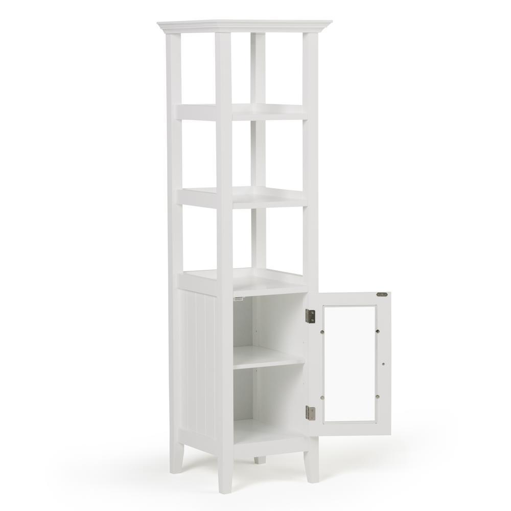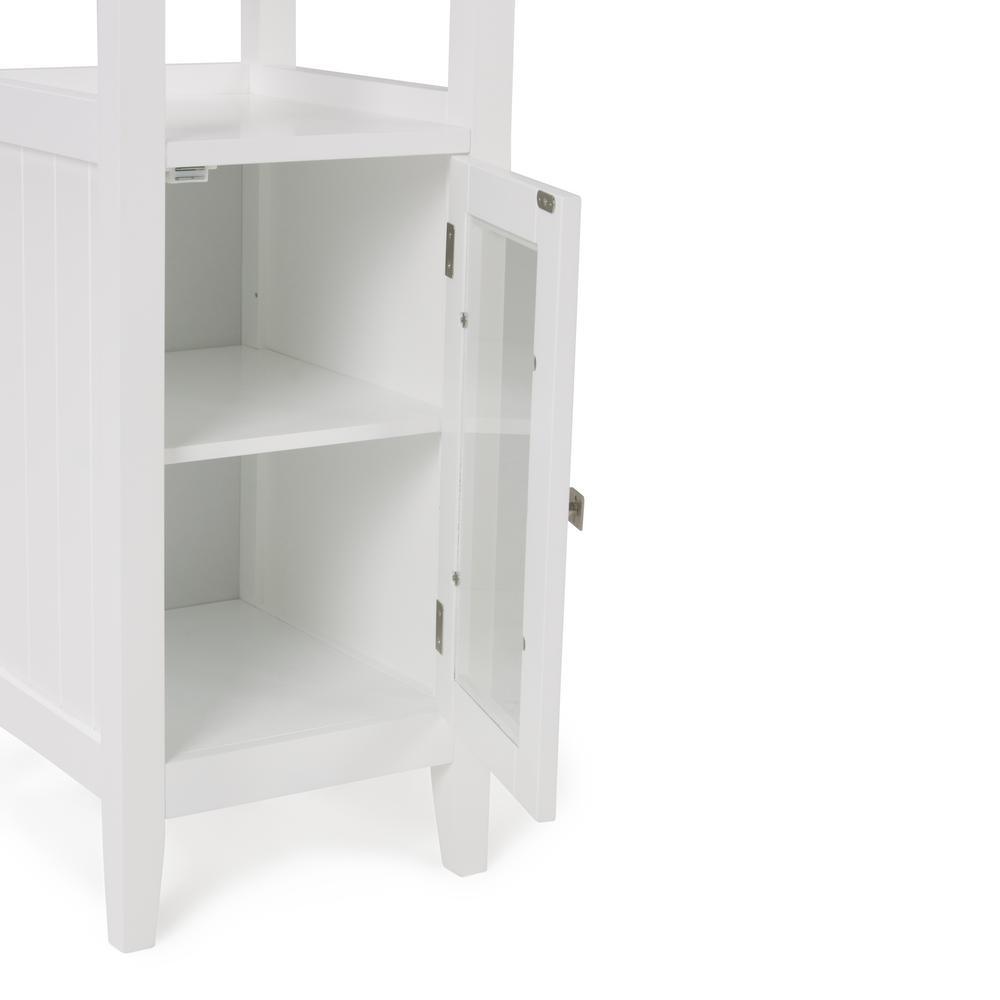 Create functional storage space in your bathroom with the Acadian Bath Storage Tower. The cabinet's slender design has a small footprint. Keep toiletries neatly tucked away behind the tempered glass door and bottom closed cabinet, while you store towels or paper supplies in the 3 open shelves for a clutter-free room.