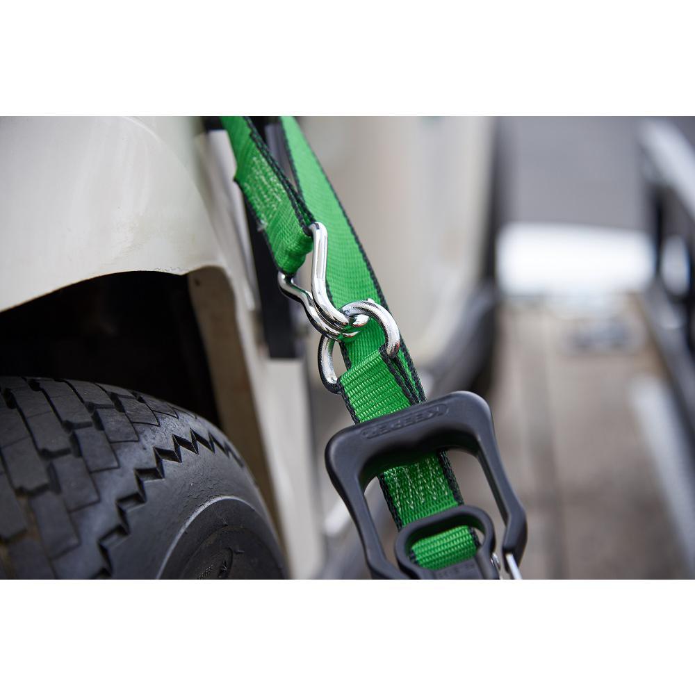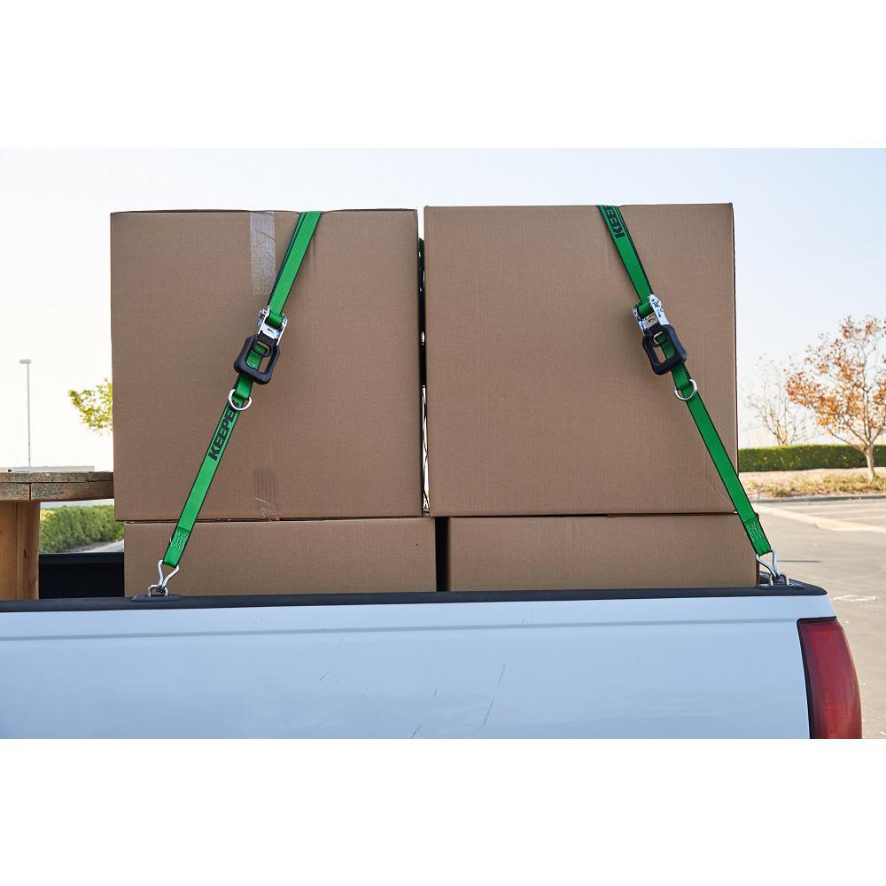 KEEPER Ratchet Tie-Downs are engineered to provide a safe, efficient alternative to rope and other methods of securing cargo for transport. The 16 ft. x 1.25 in. tie-downs with a 1,000 lb. working load limit and 3,000 lb. break strength are a perfect, everyday solution for securing moderate loads. For demanding or unpredictable conditions, ratchet tie-downs are ideal because they maximize tension. The black molded grip ratchet allow for easy handling with a chrome finish. Chrome JJ-Hooks are protected from rust and corrosion. Bright webbing for added safety with a sewn in. soft tie with D-ring.