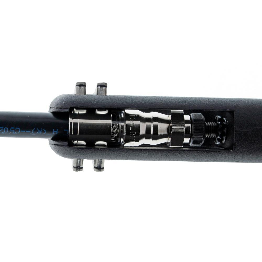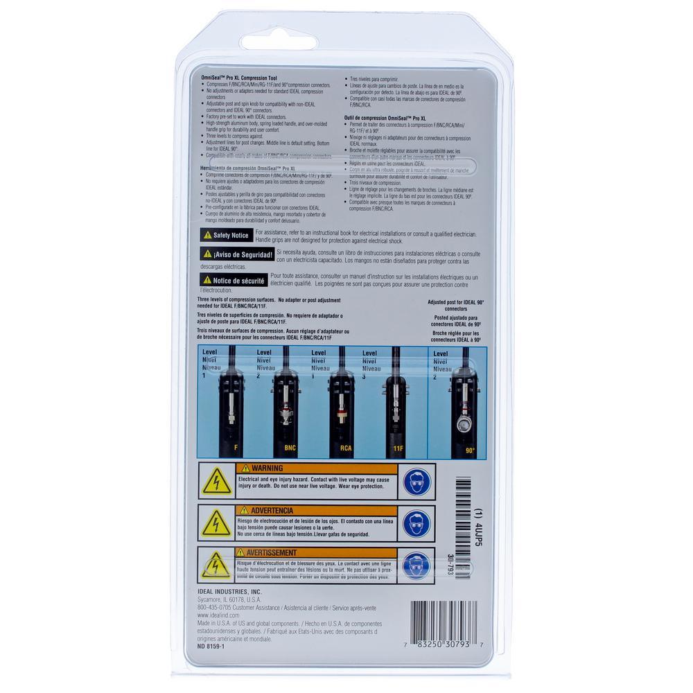 Our flagship OmniSeal Pro XL compression tool is compatible with and terminates all Ideal compression connectors. Patented dual spring clips and fixed top ledge enable this tool to compress more connectors than any other tool on the market. Unlike most compression tools which require adjustments and adapters for each type of connector, this compact 6 in. length tool compresses all straight Ideal compression connectors with no adjustments to the tool. F/BNC/RCA/RG-11 F connectors can all be terminated one after another with no setting changes. Only the 90°F and BNC connectors require a tool adjustment. An adjustable spin knob allows for compressive forces to be placed on the rim of the connector instead of the bottom of the nut when required. This is helpful for non-Ideal plastic centered connectors such as 50 BNCs or RCAs with limited structural support. It can also be used as a larger flat surface to compress against for other types of non-traditional compression connectors. The adjustable post and spin knob, combined with 3-compression surface levels, give the installer virtually unlimited options for compressing current and future connector designs.