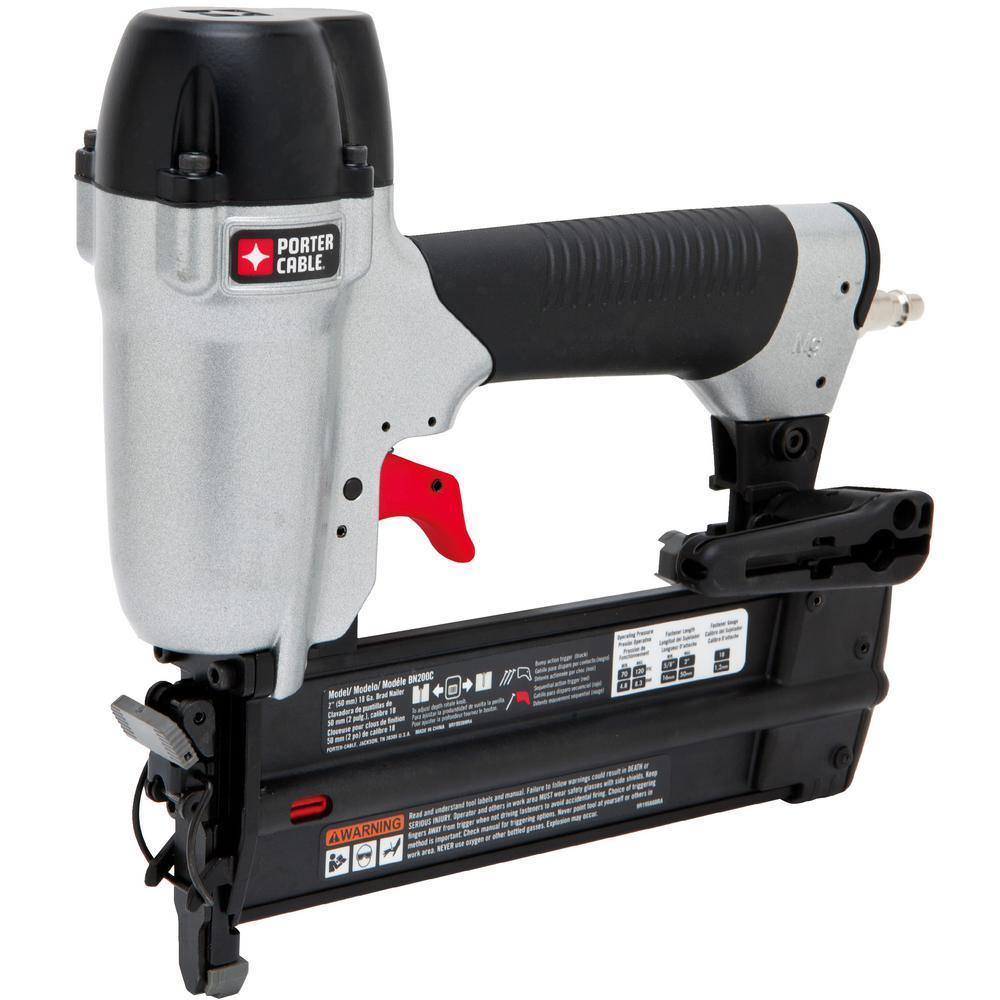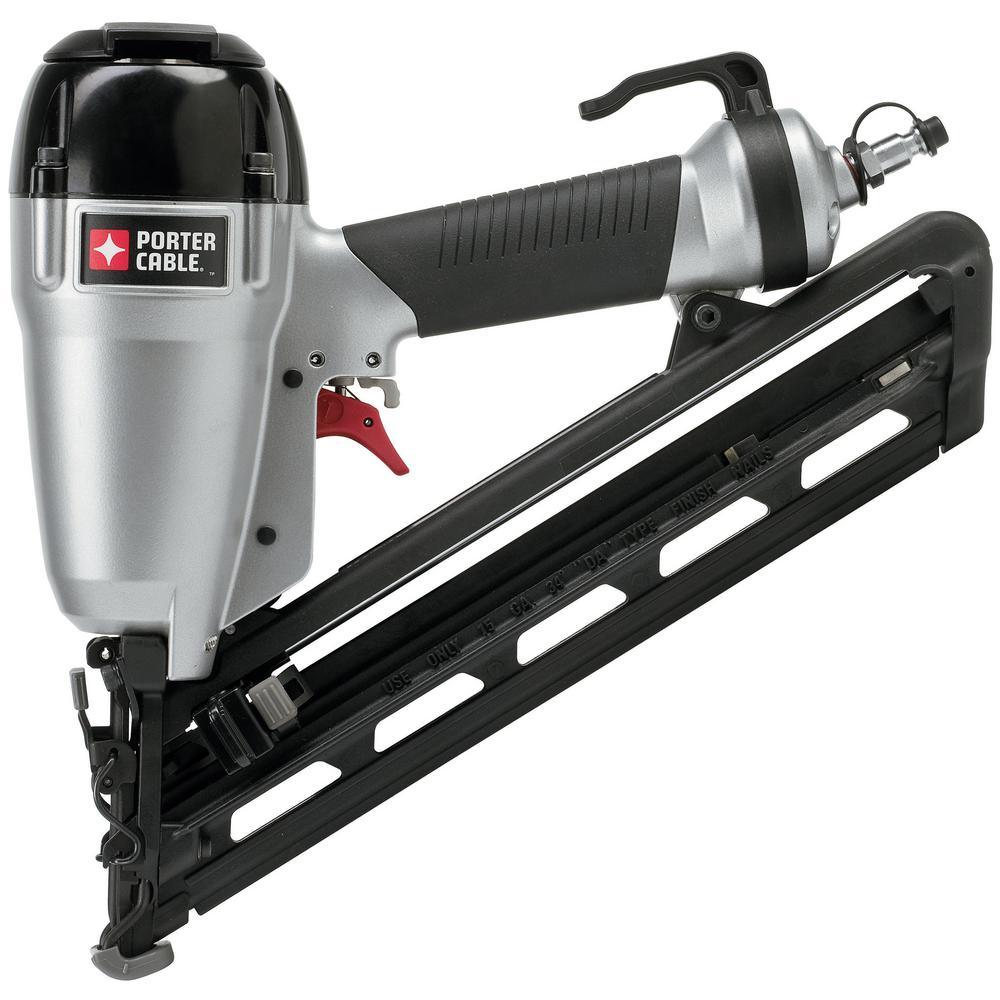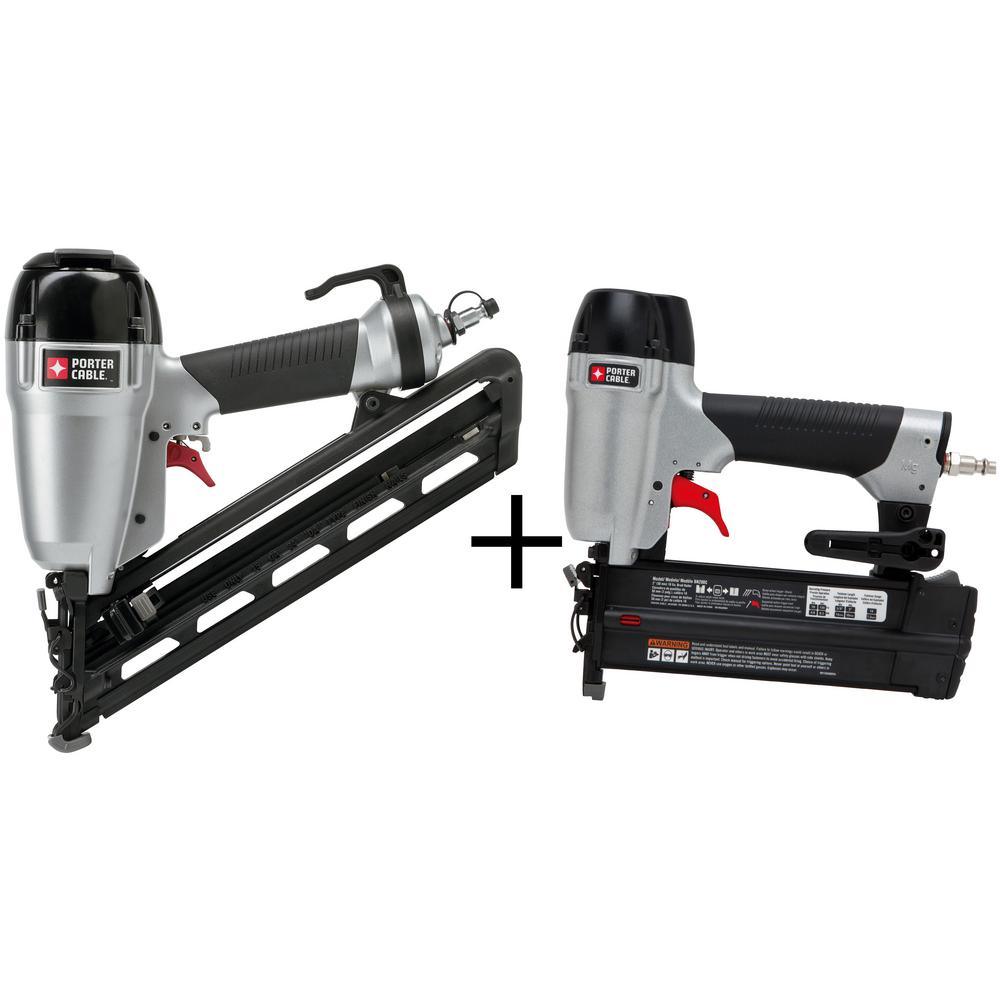 The Porter-Cable Pneumatic 2-1/2 in. 15-Gauge Strip Angled Finish Nailer Kit features a nailer with a compact body design for easy positioning and placement. An internal piston-catch mechanism keeps the piston at its initial position for consistent power and a non-marring nose tip with on-tool storage helps prevent ugly marks from nailing. The kit includes a nailer, case, finishing nails, 1/4 in. plug with cap, oil and operating manual. For a limited time get a bonus 18-Gauge Brad Nailer Kit with purchase.