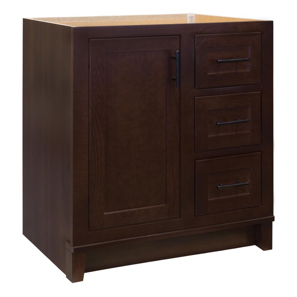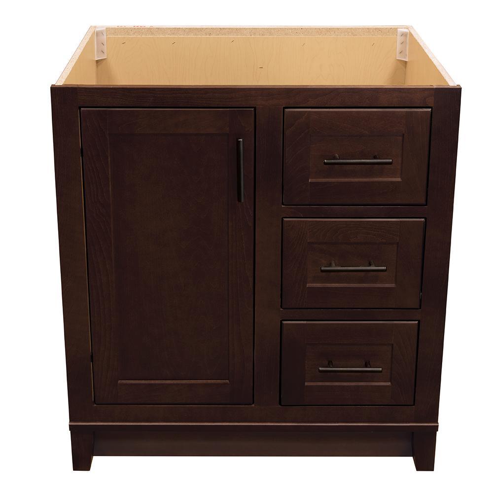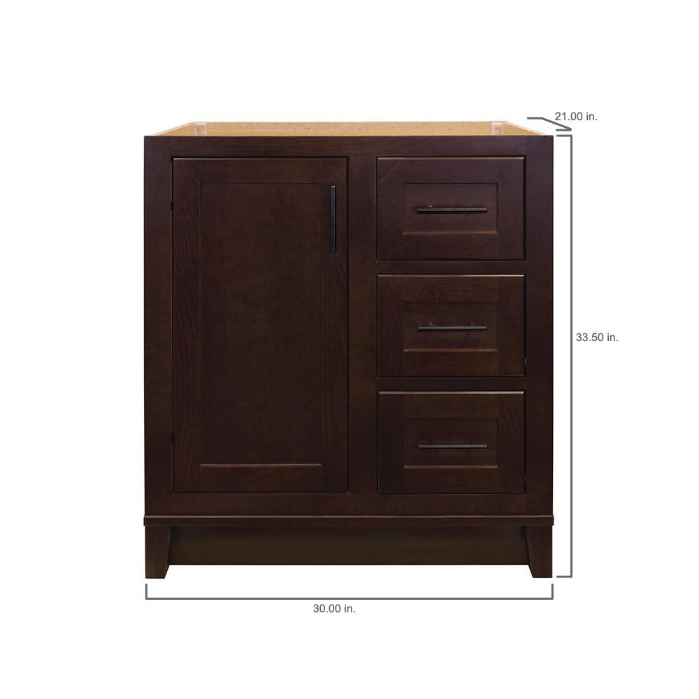 The Shaker-inspired styling of the Dark Cognac Glacier Bay Kinghurst Vanity is a simple solution to upgrade your bath or powder room decor. Beautifully accented with brushed nickel cabinet hardware, this attractive vanity has three large storage drawers with full access glides and a single cabinet for ample storage space. The cabinet measures 30 in. W x 21 in. D x 33.5 in. H and comes fully assembled. This transitional-style vanity cabinet is durably constructed and has a maple-finished interior and comes pre-assembled, ready to support a vanity top of your choosing.