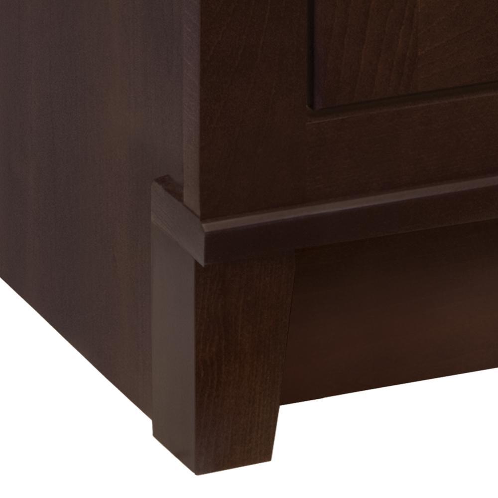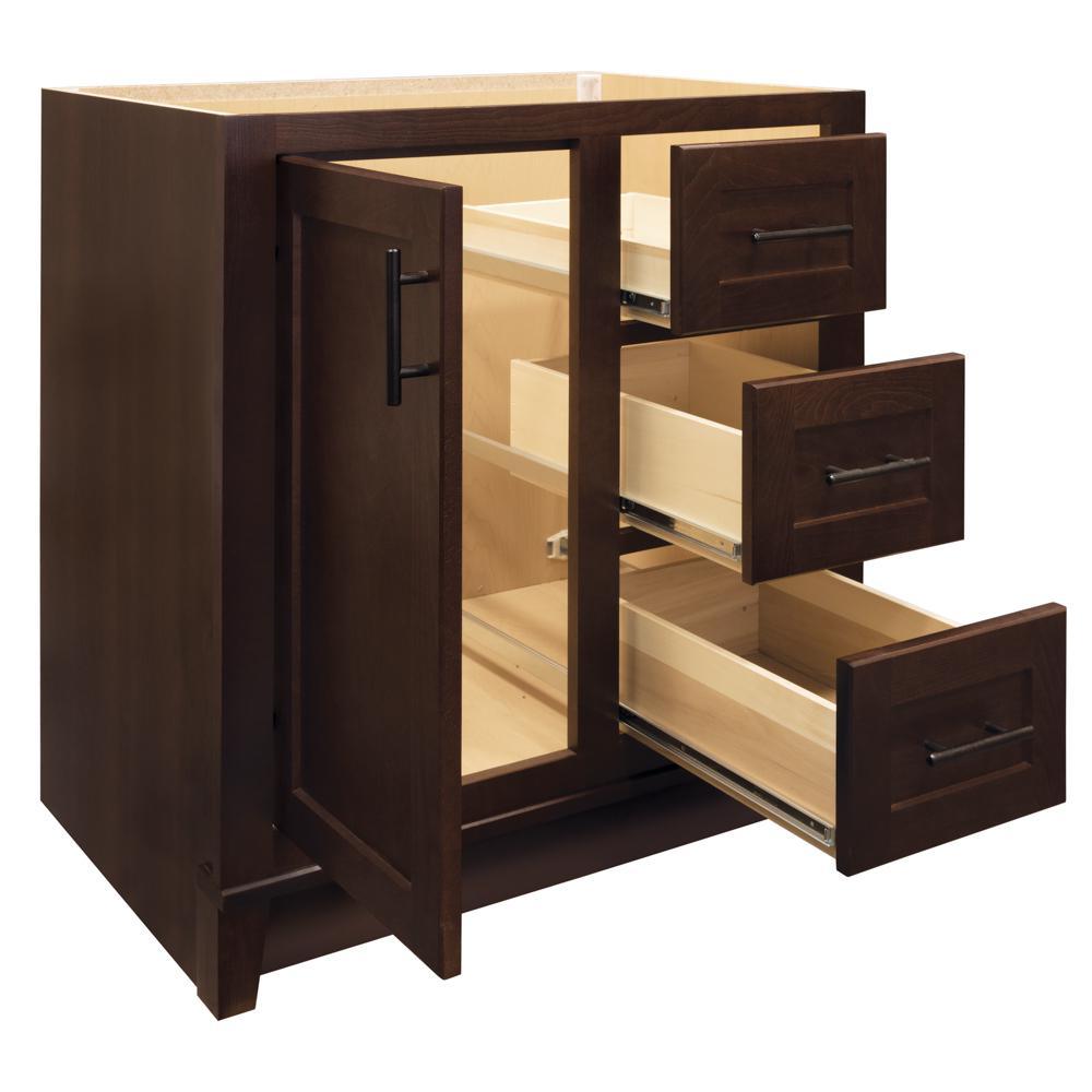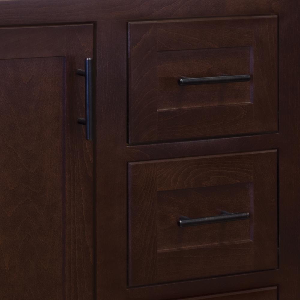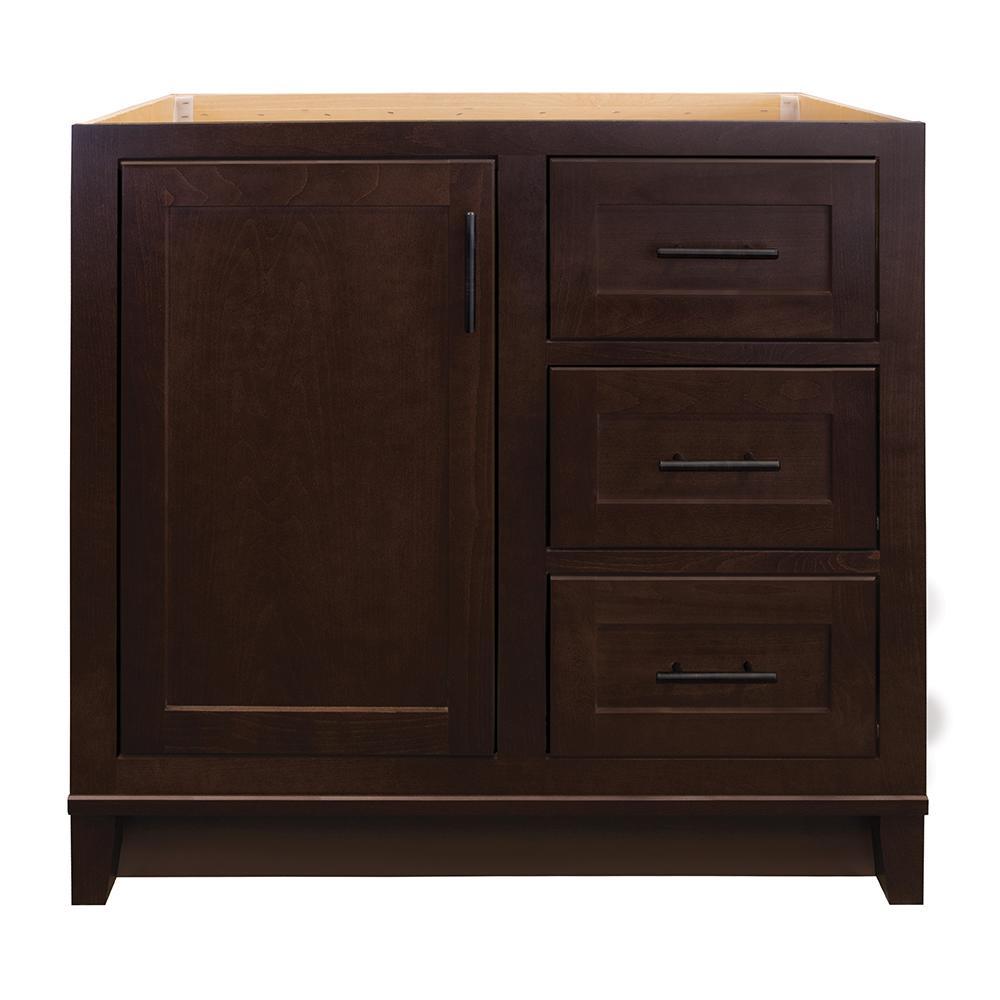 The Shaker-inspired styling of the Dark Cognac Glacier Bay Kinghurst Vanity is a simple solution to upgrade your bath or powder room decor. Beautifully accented with brushed nickel cabinet hardware, this attractive vanity has three large storage drawers with full access glides and a single cabinet for ample storage space. The cabinet measures 30 in. W x 21 in. D x 33.5 in. H and comes fully assembled. This transitional-style vanity cabinet is durably constructed and has a maple-finished interior and comes pre-assembled, ready to support a vanity top of your choosing.