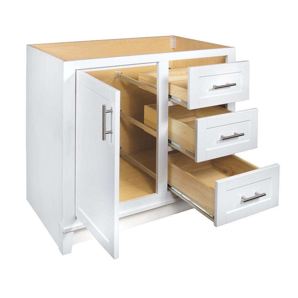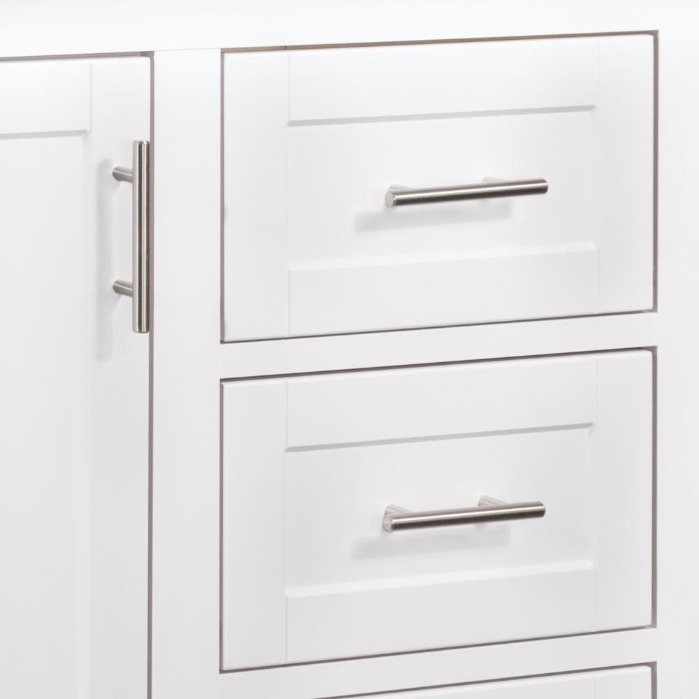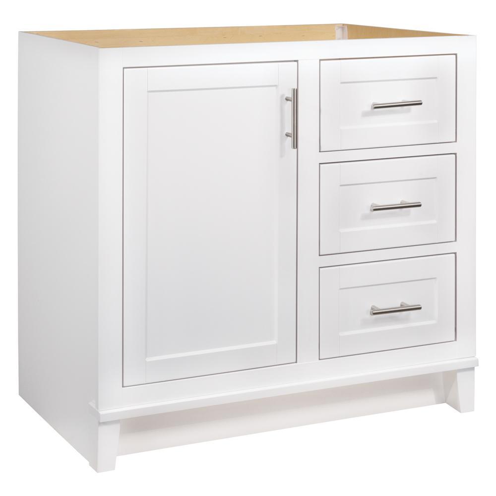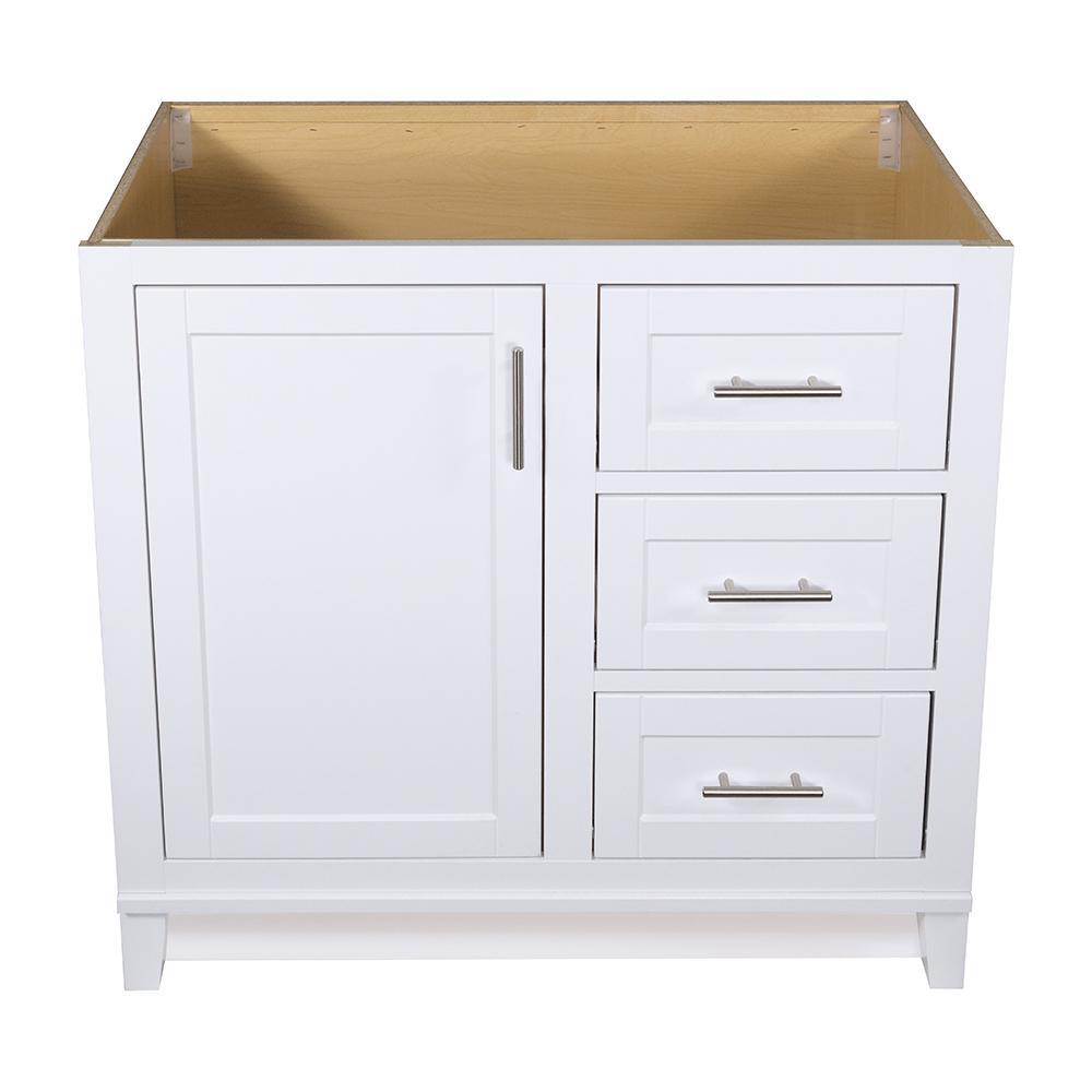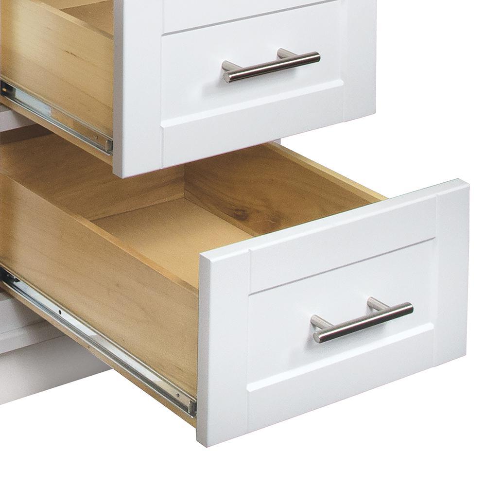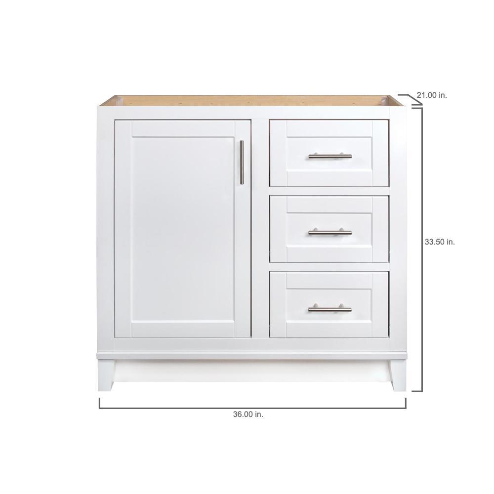 The Shaker-inspired styling of the white Glacier Bay Kinghurst Vanity is a simple solution to upgrade your bath or powder room decor. Beautifully accented with brushed nickel cabinet hardware, this attractive vanity has three large storage drawers with full access glides and a single cabinet for ample storage space. The cabinet measures 36 in. W x 21 in. D x 33.5 in. H and comes fully assembled. This transitional-style vanity cabinet is durably constructed and has a maple-finished interior and comes pre-assembled, ready to support a vanity top of your choosing.