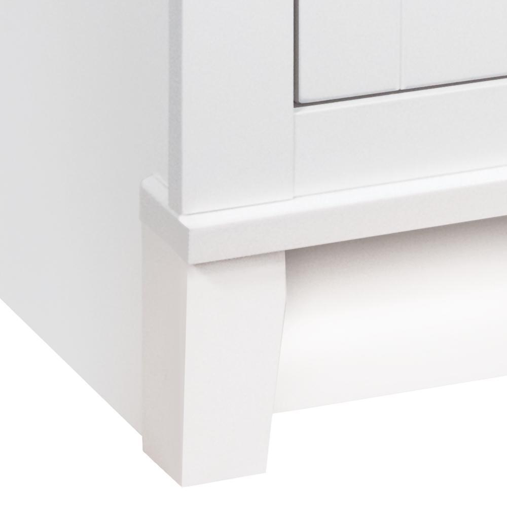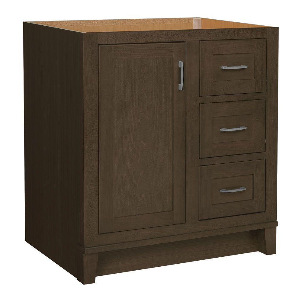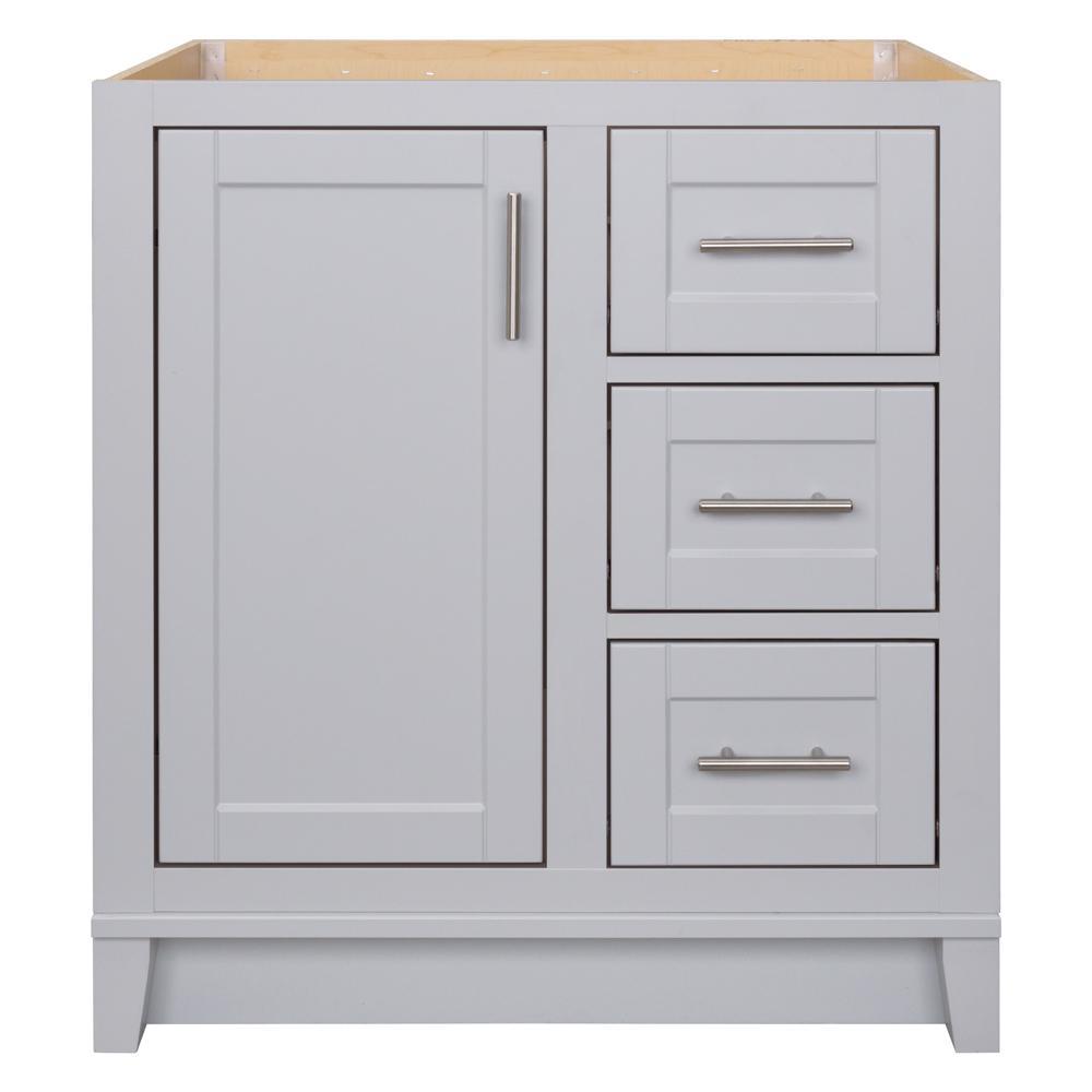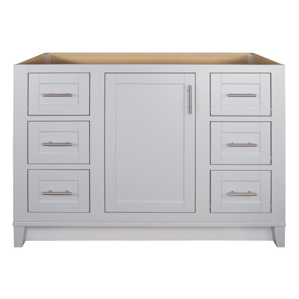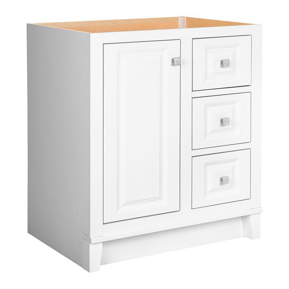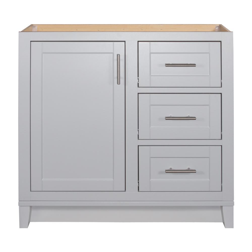 The Shaker-inspired styling of the white Glacier Bay Kinghurst Vanity is a simple solution to upgrade your bath or powder room decor. Beautifully accented with brushed nickel cabinet hardware, this attractive vanity has three large storage drawers with full access glides and a single cabinet for ample storage space. The cabinet measures 36 in. W x 21 in. D x 33.5 in. H and comes fully assembled. This transitional-style vanity cabinet is durably constructed and has a maple-finished interior and comes pre-assembled, ready to support a vanity top of your choosing.