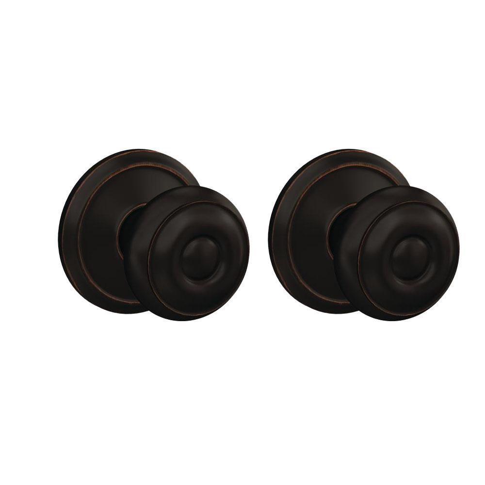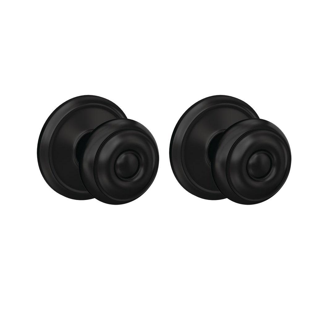 The Schlage Custom Georgian Matte Black Dummy Door Knob with Alden Trim is uniquely designed with premium style in mind, featuring low profile trim and concealed screws for a more polished look. Schlage Custom dummy hardware comes in pairs, making it perfect for French doors. The modest Georgian knob features symmetrical detailing throughout. The striking appearance of the Matte Black finish creates an elegant look that’s sure to be noticed in any style setting.