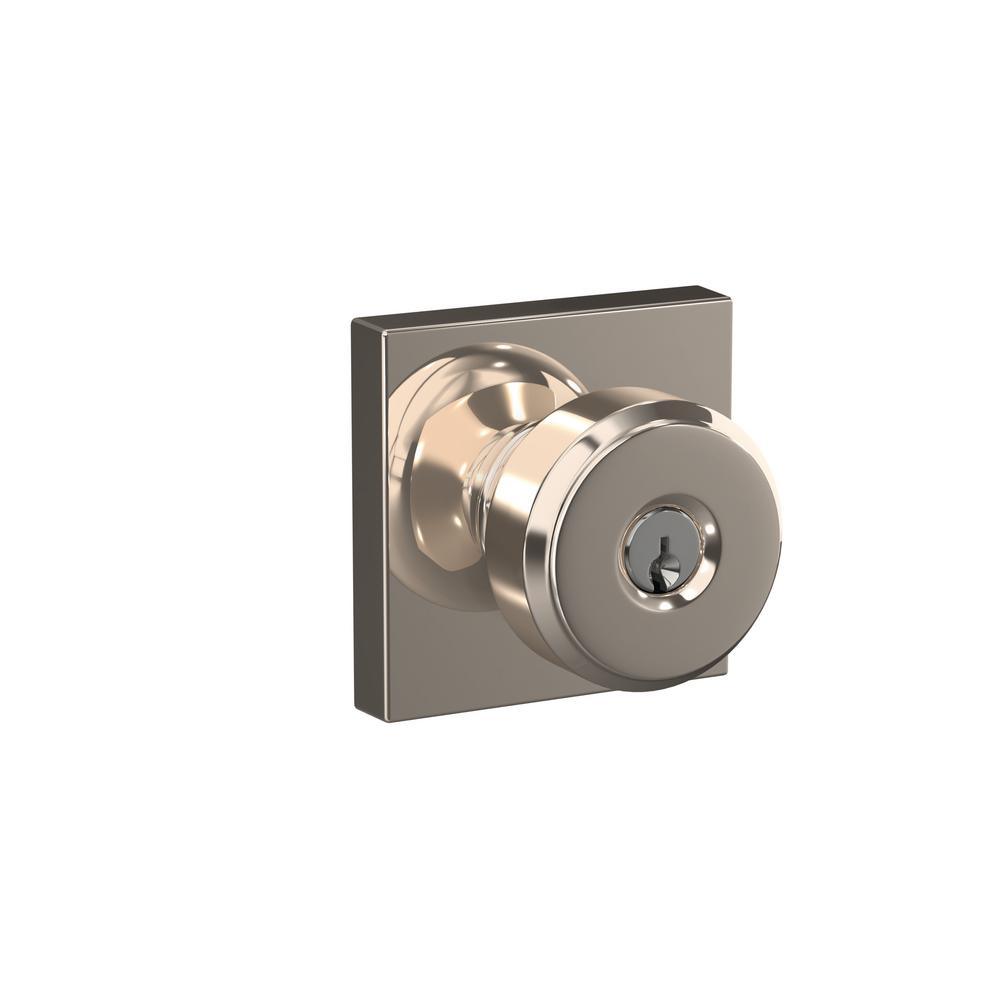 The Schlage Bowery Matte Black Keyed Entry Door Knob with Collins Trim unlocks when the door is opened from the inside, allowing you to leave quickly and conveniently, and re-enter easily. The Bowery knob's clean lines and minimalist design give it a futuristic look that is as modern as it is stylish, while the Collins trims strong lines and square shape embody refined elegance. The striking appearance of the Matte Black finish creates an elegant look that's sure to be noticed in any style setting. Plus, its been designed and tested with strength and durability in mind.