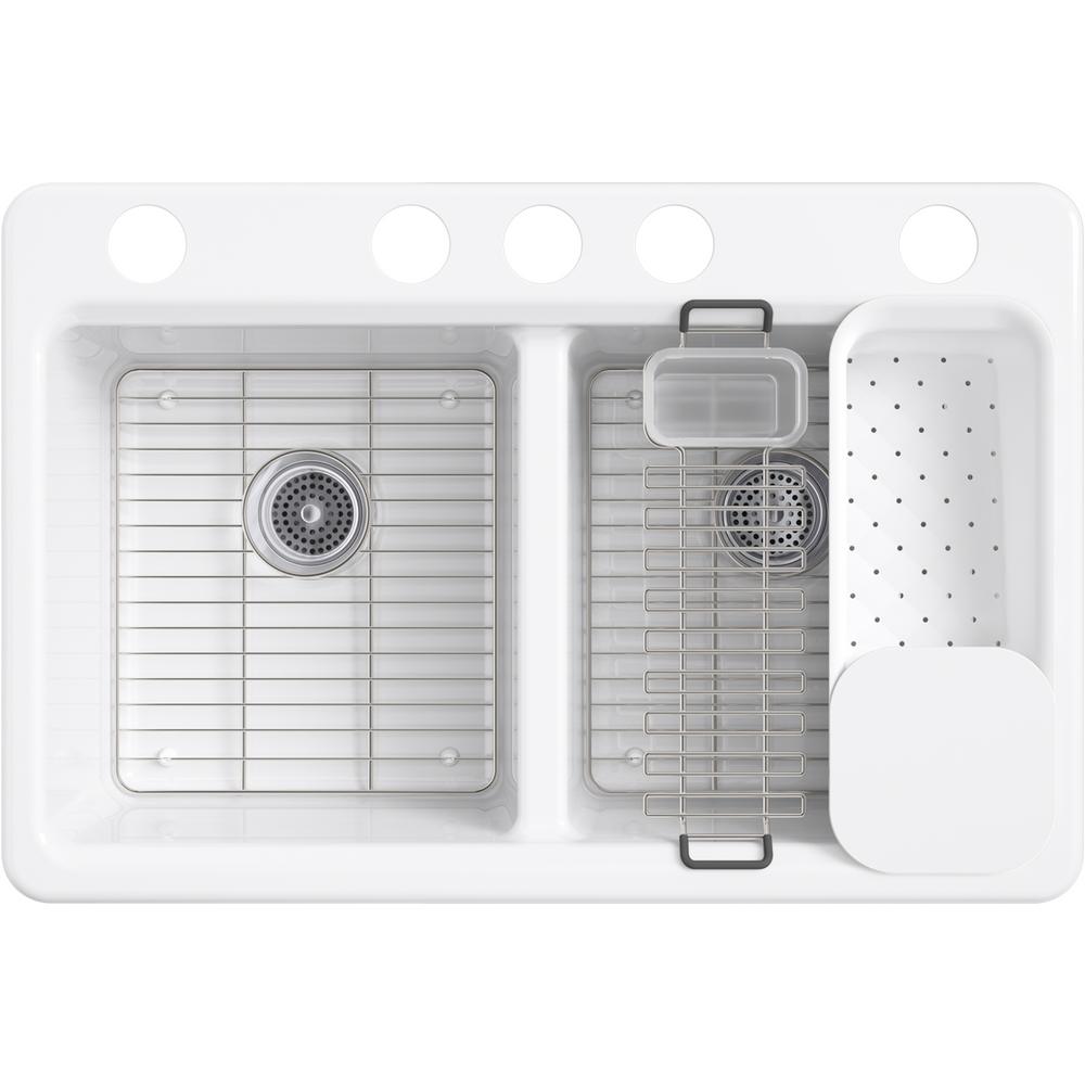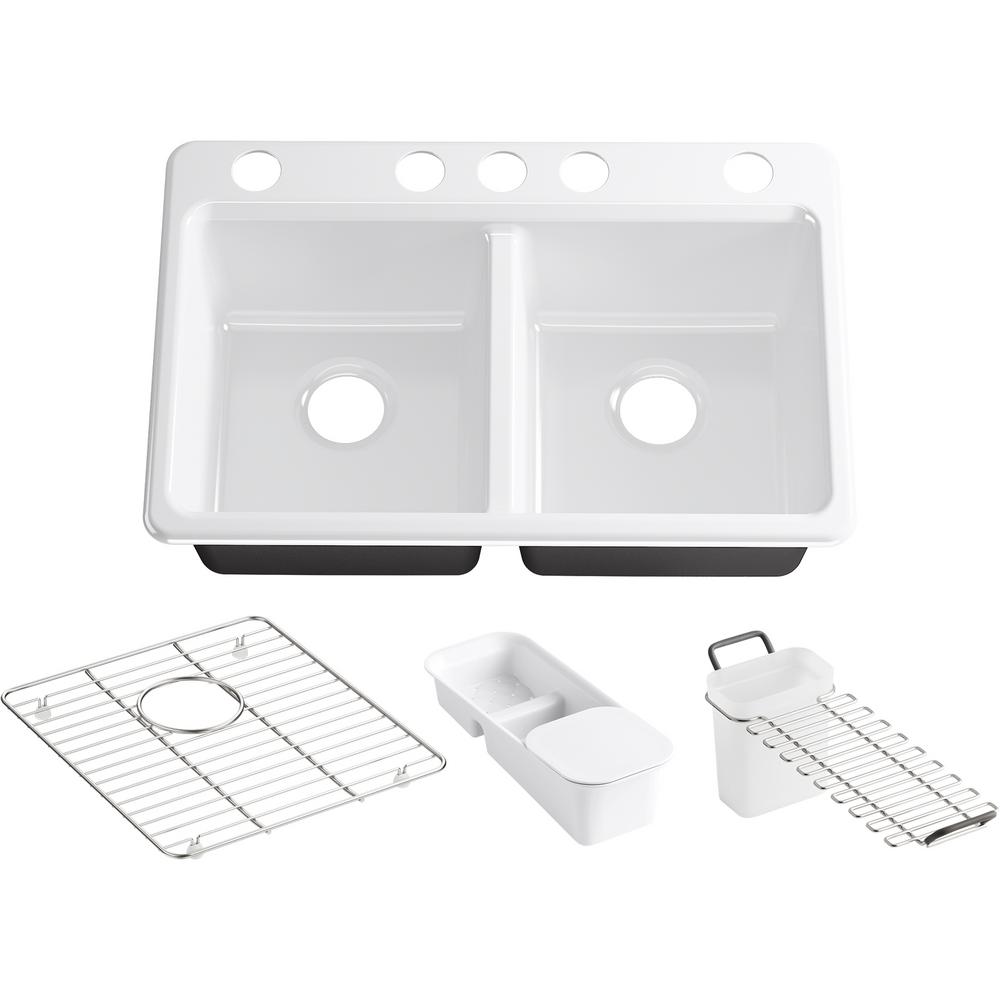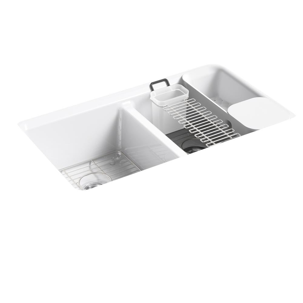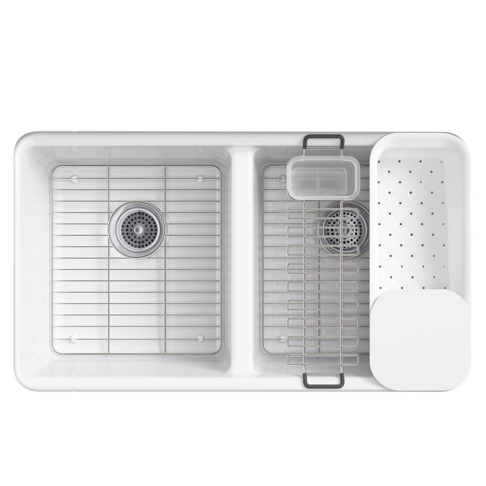 The understated beauty of this Riverby sink makes it an elegant and versatile addition to the kitchen. The two equal-sized basins feature a sloped base that minimizes water pooling. Crafted from enameled cast iron, this sink resists chipping, cracking, or burning for years of beauty and reliable performance. It comes with a custom-fit colander with integral cutting board, a utility rack with soaking cup, and a stainless-steel bottom basin rack.