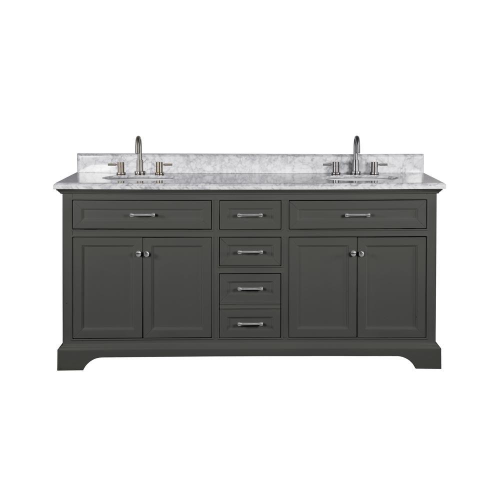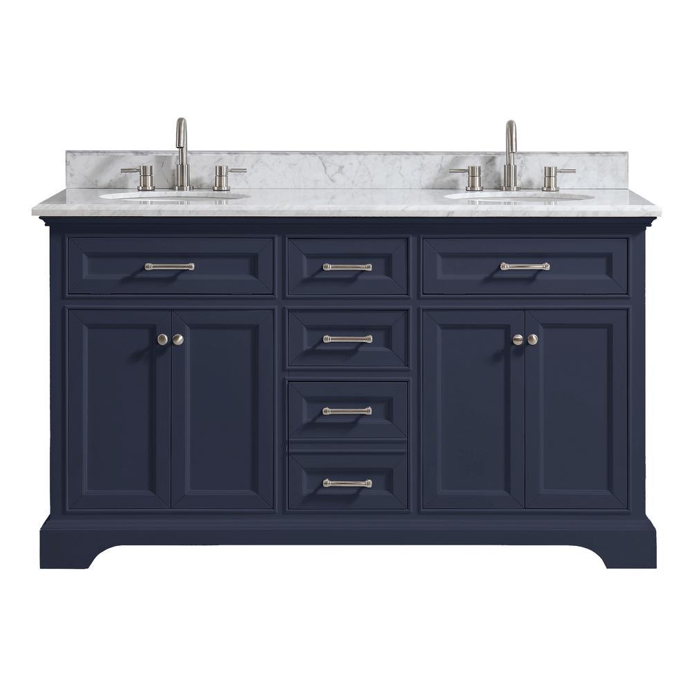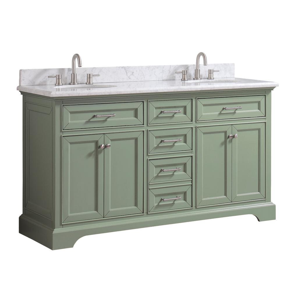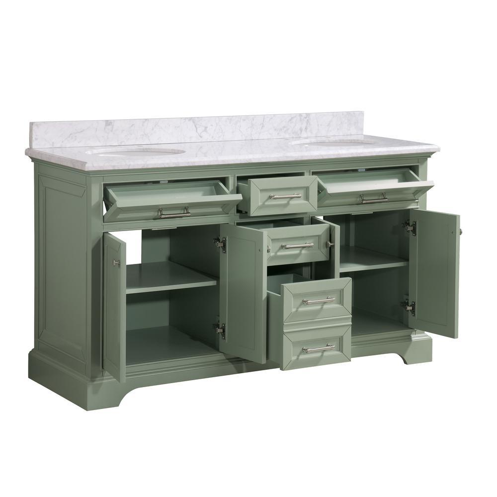 The Windlowe Collection features classical design enhanced by a soothing Sea Green finish, creating an aesthetic that mixes flair and function. The Windlowe 61 in. double vanity showcases its quality and style with a solid wood frame, Brushed nickel hardware and soft-close hinges and glides. The vanity combo includes a Carrera white marble top and two white vitreous china undermount oval sinks.