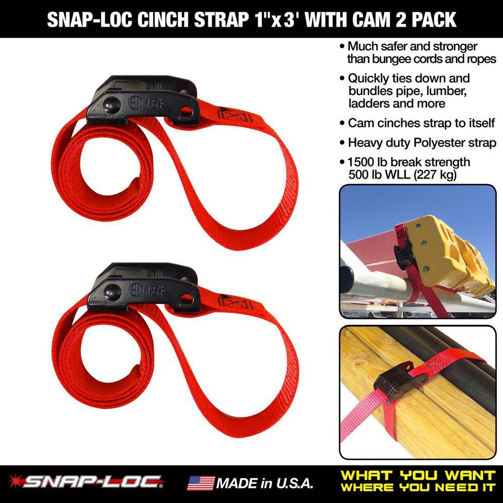 This strap quickly bundles and ties down lose pipe, lumber and more. Much safer and stronger than bungee cords and ropes. Great for all sorts of uses including on in the garage around the yard and on trucks. Quick release Cam buckle and 1 in. x 3 ft. compact size. Strap has a 1500 lbs. break strength, 500 lbs. working load and is made from heavy-duty polyester webbing. Now is the time to replace those wimpy bungee cords and ropes with SNAP-LOC Cinch Straps. Also look for our SNAP-LOC's E-track Singles for positive locking connection of professional grade logistic E-Straps, the perfect alternative to unsafe hook straps. SNAPOCS are the Fastest, Safest and Easiest way to strap down cargo Where You Want It and Where You Need It on Pickups, Trailers, Truck Racks, Walls, Ceilings, Floors and more. SNAP-LOC also offers a variety of System Accessories and other Straps for most every type of application. SNAP-LOC is Ultimate Cargo Control.