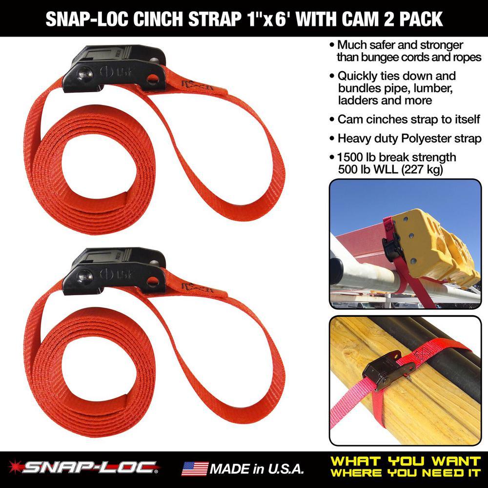 This strap quickly bundles and ties down lose pipe, lumber and more. Much safer and stronger than bungee cords and ropes. Great for all sorts of uses including on in the garage around the yard and on trucks. Quick release Cam buckle and 1 in. x 6 ft. compact size. Strap has a 1500 lbs. break strength, 500 lbs. working load and is made from heavy-duty polyester webbing. Now is the time to replace those wimpy bungee cords and ropes with SNAP-LOC Cinch Straps. Also look for our SNAP-LOC's E-track Singles for positive locking connection of professional grade logistic E-Straps, the perfect alternative to unsafe hook straps. SNAPOCS are the Fastest, Safest and Easiest way to strap down cargo Where You Want It and Where You Need It on Pickups, Trailers, Truck Racks, Walls, Ceilings, Floors and more. SNAP-LOC also offers a variety of System Accessories and other Straps for most every type of application. SNAP-LOC is Ultimate Cargo Control.